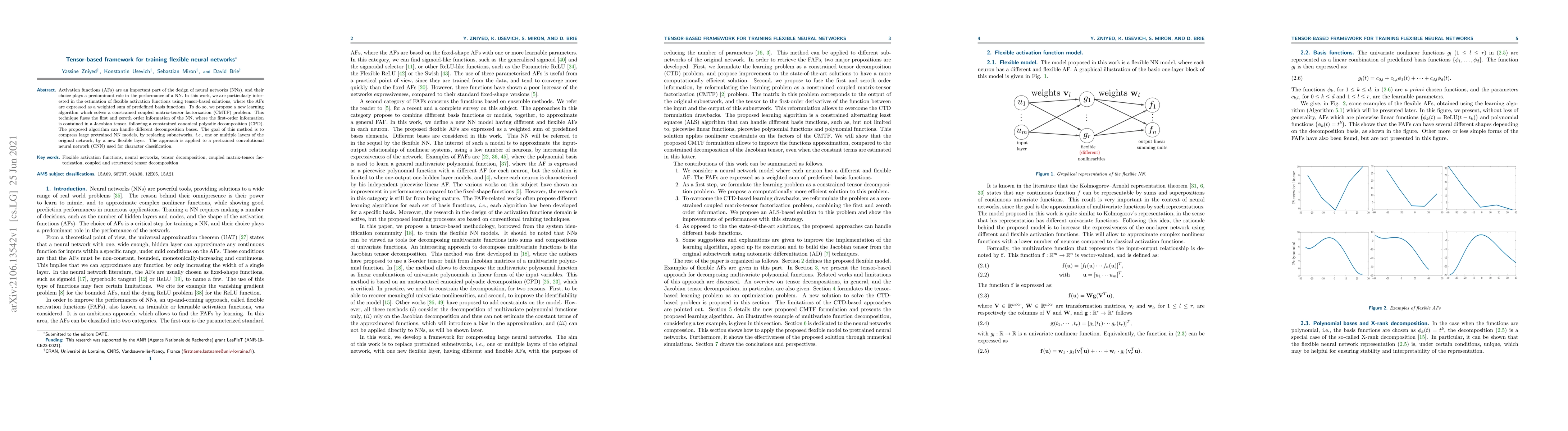 The paper proposes a tensor-based framework for training flexible neural networks, using a constrained coupled matrix-tensor factorization (CMTF) problem. It introduces a new learning algorithm that can handle different decomposition bases, fusing first and zeroth order information of the neural network to compress large pretrained models by replacing subnetworks with a flexible layer.