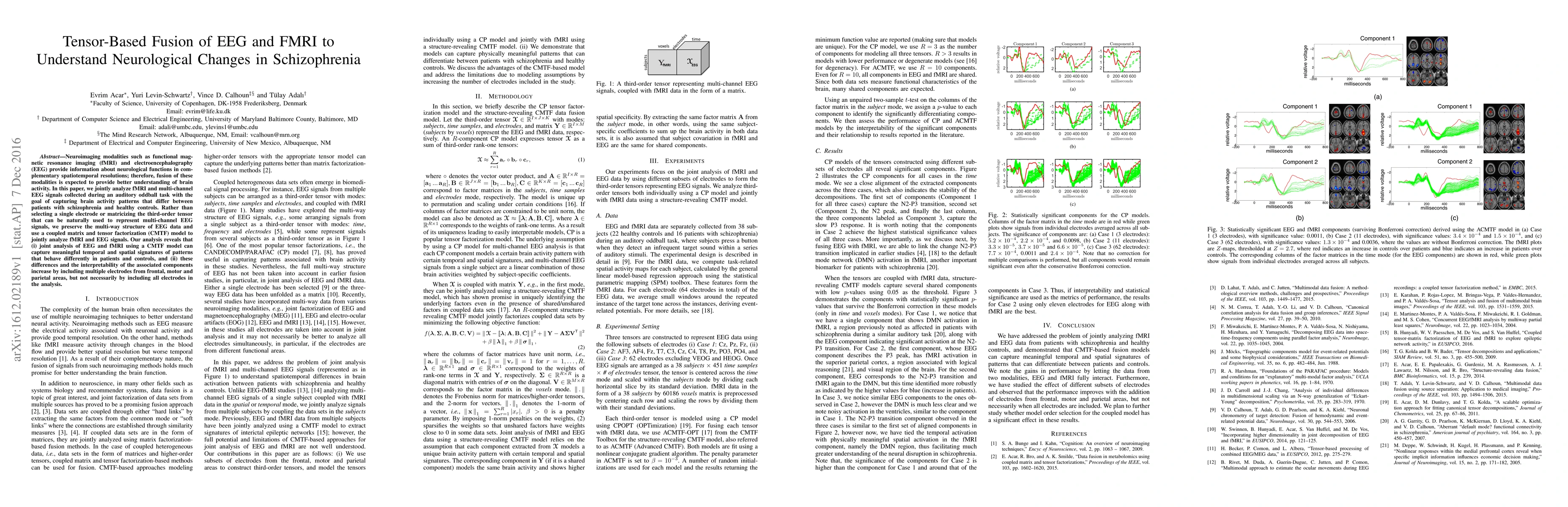 This study employs tensor-based fusion of fMRI and EEG data to uncover neurological differences in schizophrenia. Using a coupled matrix and tensor factorization model, it reveals distinct brain activity patterns in patients versus healthy controls, emphasizing the importance of multi-electrode inclusion from frontal, motor, and parietal areas.