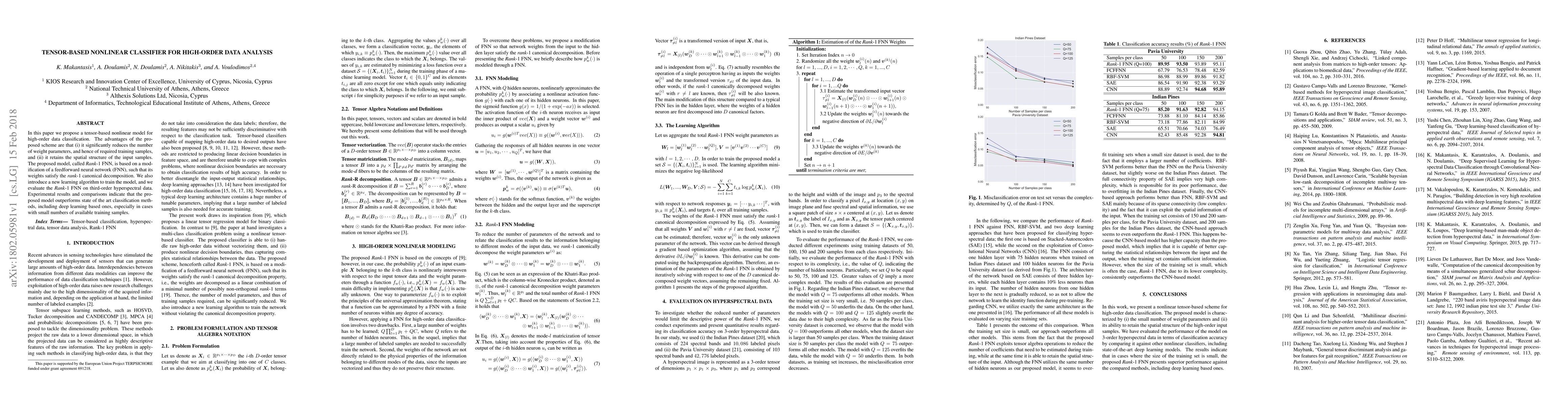 In this paper we propose a tensor-based nonlinear model for high-order data classification. The advantages of the proposed scheme are that (i) it significantly reduces the number of weight parameters, and hence of required training samples, and (ii) it retains the spatial structure of the input samples. The proposed model, called \textit{Rank}-1 FNN, is based on a modification of a feedforward neural network (FNN), such that its weights satisfy the {\it rank}-1 canonical decomposition. We also introduce a new learning algorithm to train the model, and we evaluate the \textit{Rank}-1 FNN on third-order hyperspectral data. Experimental results and comparisons indicate that the proposed model outperforms state of the art classification methods, including deep learning based ones, especially in cases with small numbers of available training samples.