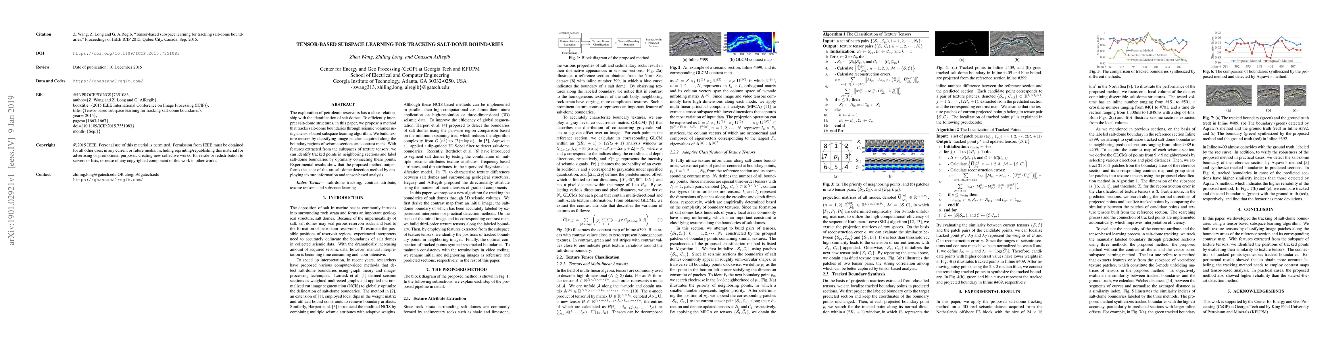 This paper proposes a tensor-based subspace learning method to track salt-dome boundaries in seismic volumes, using texture tensors and optimal connection of tracked points. The method outperforms existing techniques by leveraging texture information and tensor analysis.