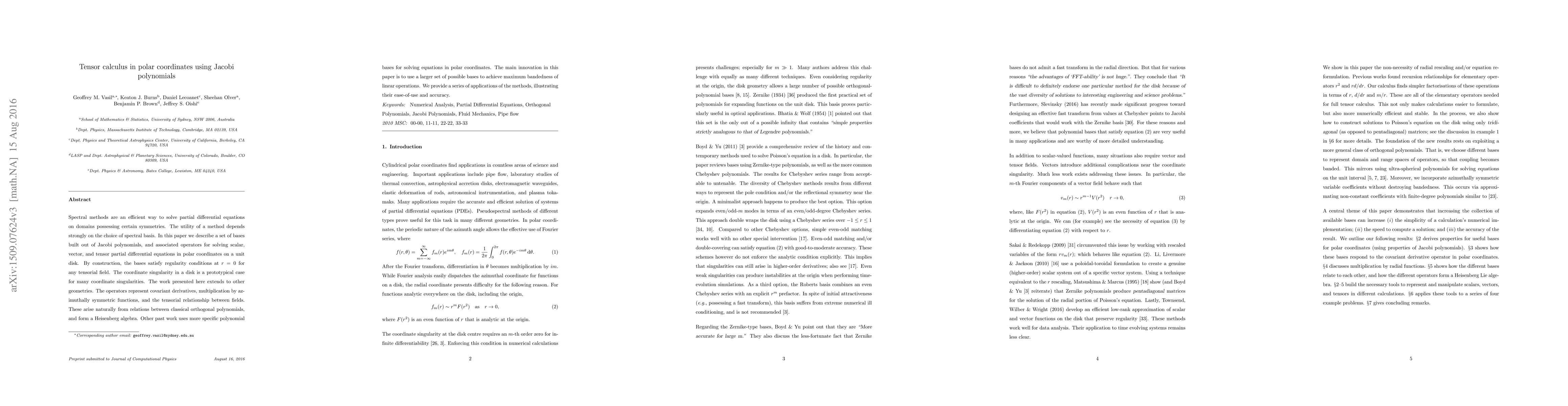 This paper introduces a spectral method using Jacobi polynomials for solving partial differential equations in polar coordinates on a unit disk, focusing on scalar, vector, and tensor fields. The method achieves maximum bandedness of linear operations and handles coordinate singularities effectively, extending to other geometries.