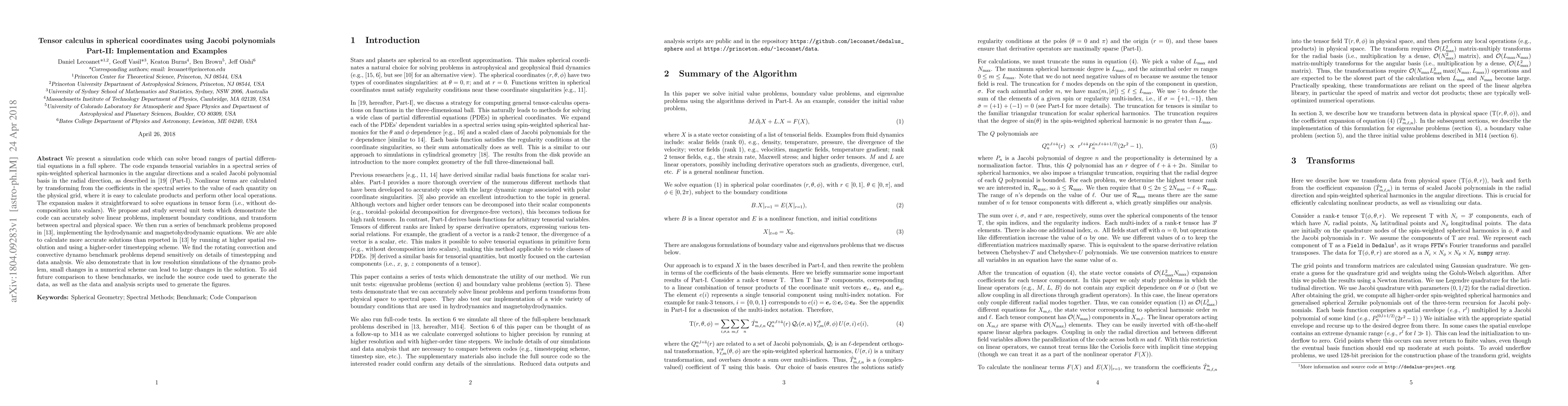 We present a simulation code which can solve broad ranges of partial differential equations in a full sphere. The code expands tensorial variables in a spectral series of spin-weighted spherical harmonics in the angular directions and a scaled Jacobi polynomial basis in the radial direction, as described in Part-I. Nonlinear terms are calculated by transforming from the coefficients in the spectral series to the value of each quantity on the physical grid, where it is easy to calculate products and perform other local operations. The expansion makes it straightforward to solve equations in tensor form (i.e., without decomposition into scalars). We propose and study several unit tests which demonstrate the code can accurately solve linear problems, implement boundary conditions, and transform between spectral and physical space. We then run a series of benchmark problems proposed in Marti et al (2014), implementing the hydrodynamic and magnetohydrodynamic equations. We are able to calculate more accurate solutions than reported in Marti et al 2014 by running at higher spatial resolution and using a higher-order timestepping scheme. We find the rotating convection and convective dynamo benchmark problems depend sensitively on details of timestepping and data analysis. We also demonstrate that in low resolution simulations of the dynamo problem, small changes in a numerical scheme can lead to large changes in the solution. To aid future comparison to these benchmarks, we include the source code used to generate the data, as well as the data and analysis scripts used to generate the figures.