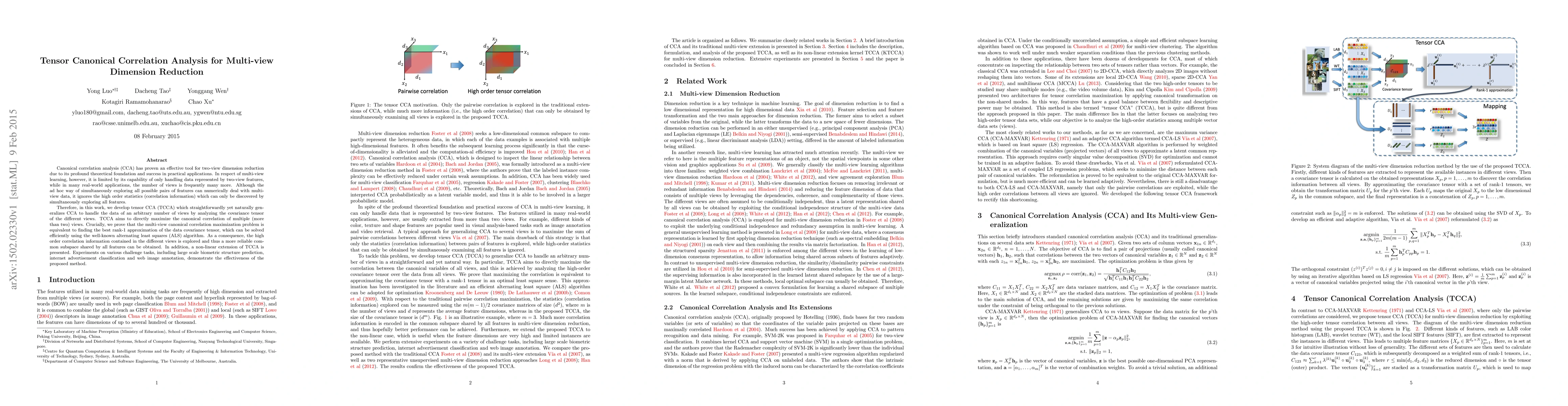 This paper introduces tensor canonical correlation analysis (TCCA) to extend canonical correlation analysis for multi-view dimension reduction, enabling the handling of data with an arbitrary number of views. It demonstrates that TCCA maximizes the canonical correlation across multiple views by finding the best rank-1 approximation of the data covariance tensor, solved efficiently via the alternating least squares algorithm, and shows its effectiveness through various applications.