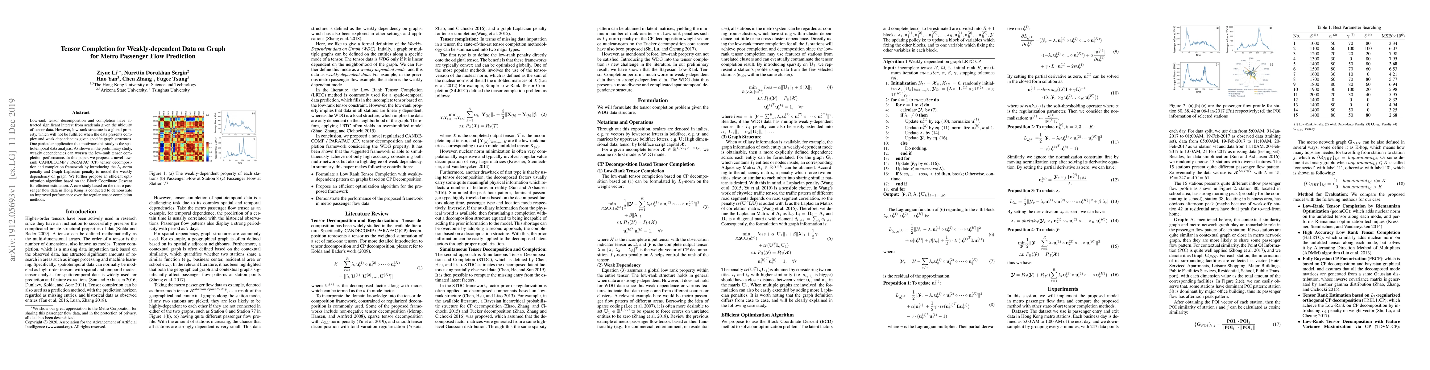 This paper proposes a novel tensor decomposition and completion framework incorporating $L_{1}$-norm and Graph Laplacian penalties to model weak dependencies in graph-structured data, specifically for metro passenger flow prediction. An efficient Block Coordinate Descent optimization algorithm is developed, and results show improved performance over traditional methods using Hong Kong metro data.