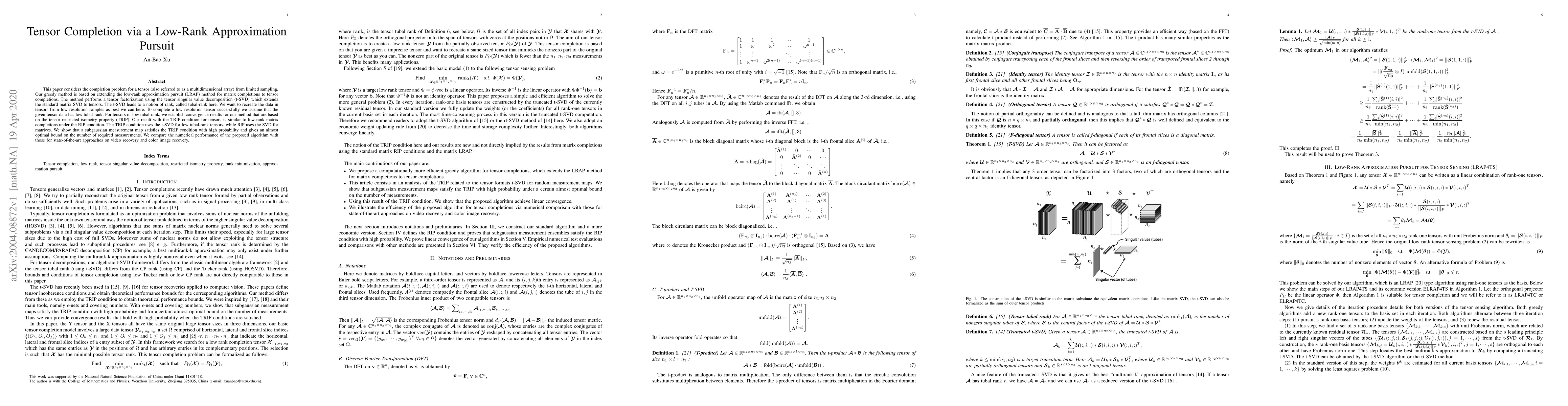 This paper proposes a tensor completion method based on low-rank approximation pursuit, extending the tensor singular value decomposition (t-SVD) to tensors. The method assumes low tubal-rank and establishes convergence under the tensor restricted isometry property (TRIP), achieving near-optimal measurement requirements.
