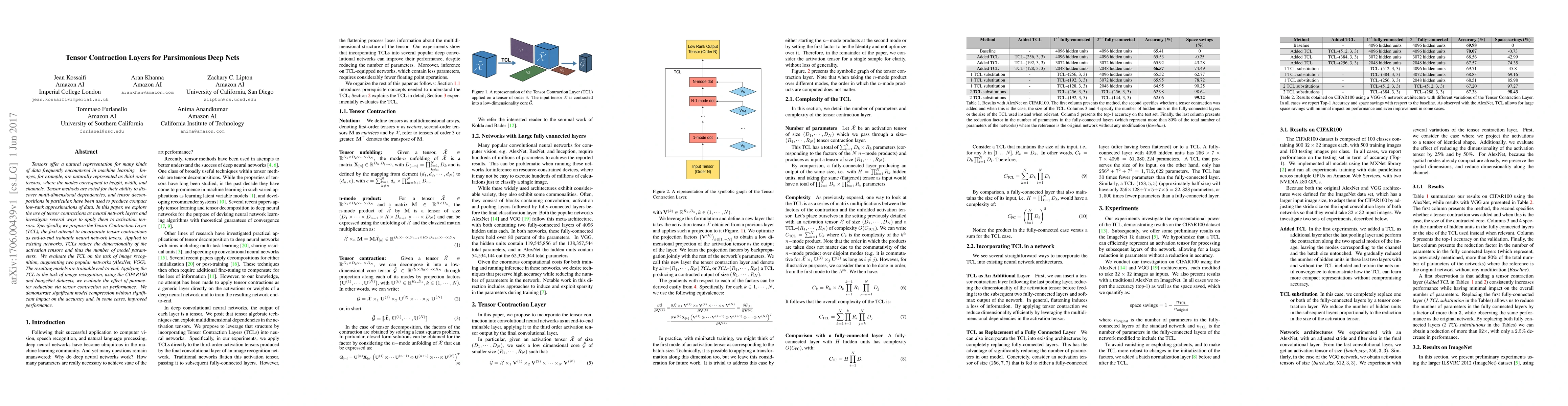 This paper proposes Tensor Contraction Layers (TCL) as a novel neural network layer that utilizes tensor contractions to reduce model parameters while maintaining or improving performance on image recognition tasks. Experiments on AlexNet and VGG networks show significant model compression with minimal loss in accuracy and, in some cases, improved results.