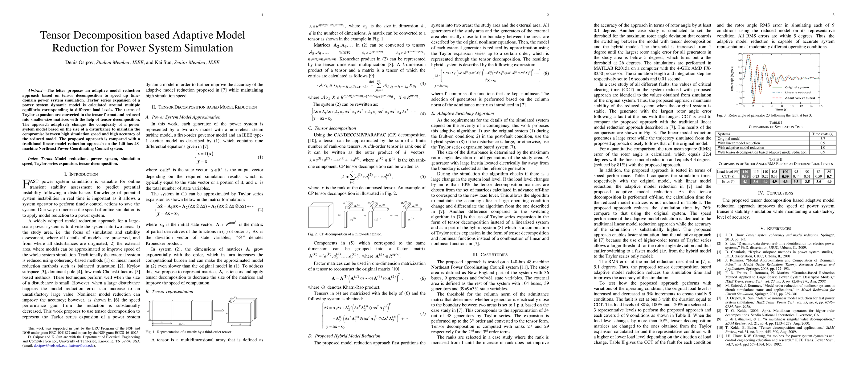 The paper introduces an adaptive model reduction method using tensor decomposition to accelerate power system simulations, balancing speed and accuracy by dynamically adjusting model complexity based on disturbance size. The method is evaluated against a traditional linear model reduction on a large power system model.