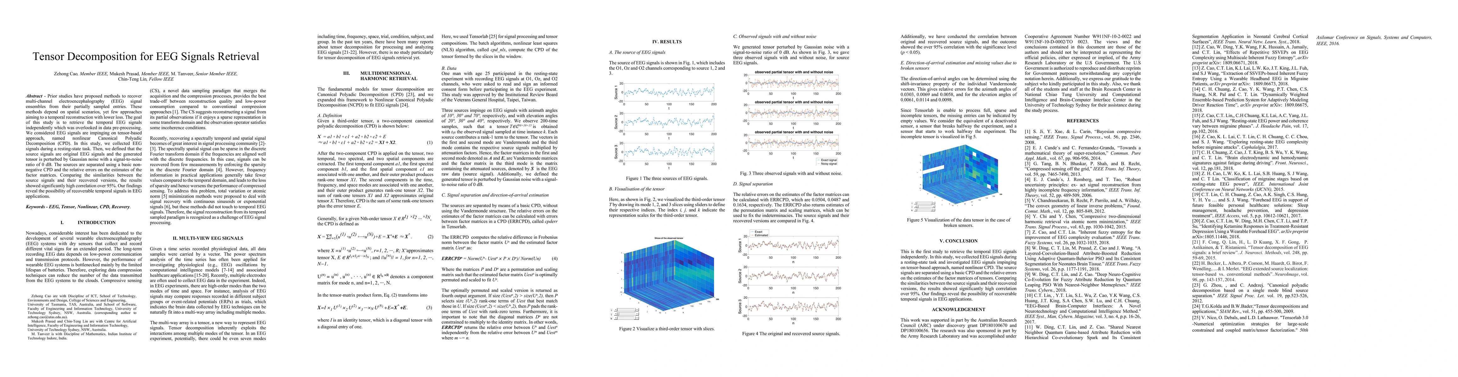 Prior studies have proposed methods to recover multi-channel electroencephalography (EEG) signal ensembles from their partially sampled entries. These methods depend on spatial scenarios, yet few approaches aiming to a temporal reconstruction with lower loss. The goal of this study is to retrieve the temporal EEG signals independently which was overlooked in data pre-processing. We considered EEG signals are impinging on tensor-based approach, named nonlinear Canonical Polyadic Decomposition (CPD). In this study, we collected EEG signals during a resting-state task. Then, we defined that the source signals are original EEG signals and the generated tensor is perturbed by Gaussian noise with a signal-to-noise ratio of 0 dB. The sources are separated using a basic non-negative CPD and the relative errors on the estimates of the factor matrices. Comparing the similarities between the source signals and their recovered versions, the results showed significantly high correlation over 95%. Our findings reveal the possibility of recoverable temporal signals in EEG applications.