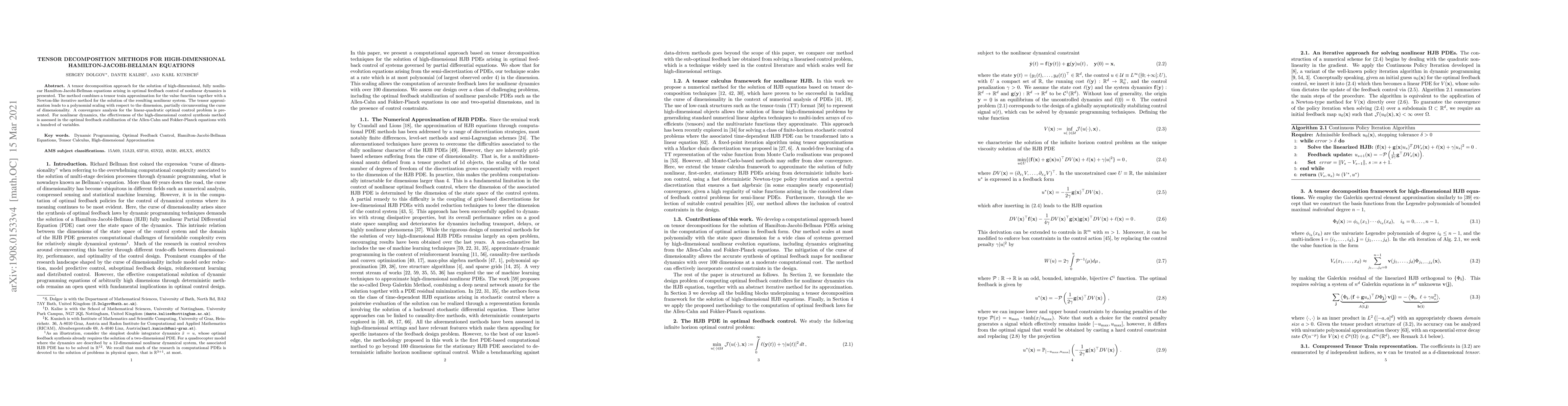 This paper proposes a tensor decomposition method for solving high-dimensional Hamilton-Jacobi-Bellman equations in optimal control, leveraging tensor train approximations and Newton-like iterations to achieve polynomial scaling. The method is tested on the stabilization of Allen-Cahn and Fokker-Planck equations with hundreds of variables.