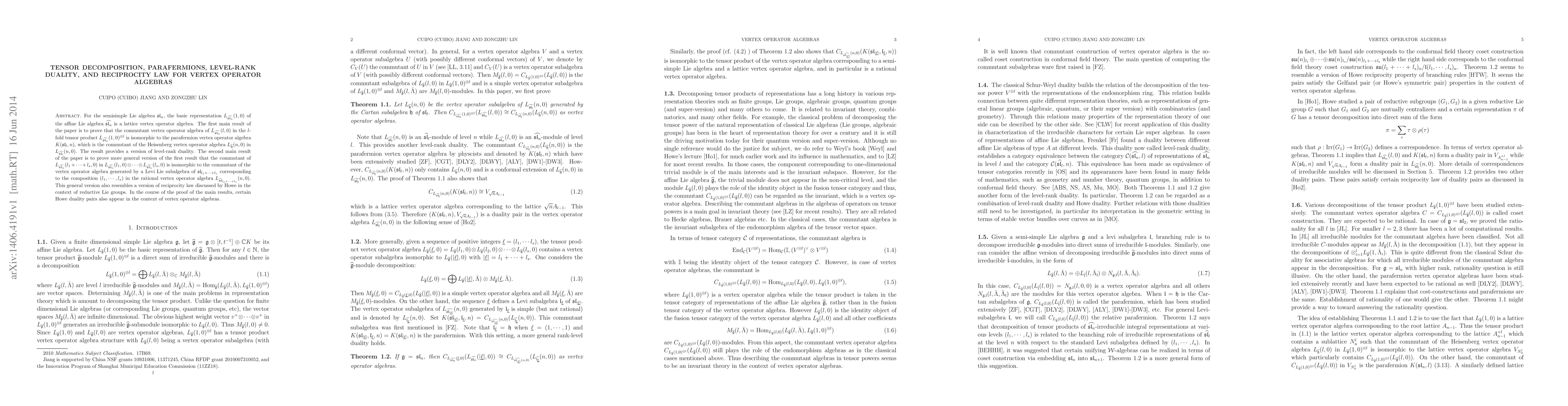 For the semisimple Lie algebra $ \frak{sl}_n$, the basic representation $L_{\widehat{\frak{sl}_{n}}}(1,0)$ of the affine Lie algebra $\widehat{\frak{sl}_{n}}$ is a lattice vertex operator algebra. The first main result of the paper is to prove that the commutant vertex operator algebra of $ L_{\widehat{\frak{sl}_{n}}}(l,0)$ in the $l$-fold tensor product $ L_{\widehat{\frak{sl}_{n}}}(1,0)^{\otimes l}$ is isomorphic to the parafermion vertex operator algebra $K(\frak{sl}_{l},n)$, which is the commutant of the Heisenberg vertex operator algebra $L_{\widehat{\frak{h}}}(n,0) $ in $L_{\widehat{\frak{sl}_l}}(n,0)$. The result provides a version of level-rank duality. The second main result of the paper is to prove more general version of the first result that the commutant of $ L_{\widehat{\frak{sl}_{n}}}(l_1+\cdots +l_s, 0)$ in $L_{\widehat{\frak{sl}_{n}}}(l_1,0)\otimes \cdots \otimes L_{\widehat{\frak{sl}_{n}}}(l_s, 0)$ is isomorphic to the commutant of the vertex operator algebra generated by a Levi Lie subalgebra of $\frak{sl}_{l_1+\cdots+l_s}$ corresponding to the composition $(l_1, \cdots, l_s)$ in the rational vertex operator algebra $ L_{\widehat{\frak{sl}}_{l_1+\cdots +l_s}}(n,0)$. This general version also resembles a version of reciprocity law discussed by Howe in the context of reductive Lie groups. In the course of the proof of the main results, certain Howe duality pairs also appear in the context of vertex operator algebras.
