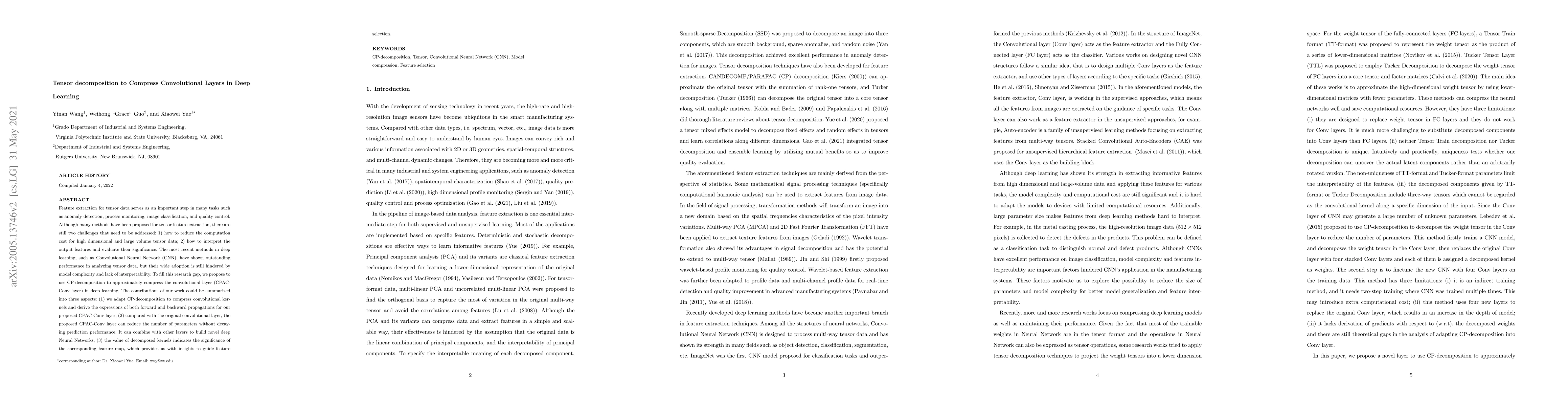 Feature extraction for tensor data serves as an important step in many tasks such as anomaly detection, process monitoring, image classification, and quality control. Although many methods have been proposed for tensor feature extraction, there are still two challenges that need to be addressed: 1) how to reduce the computation cost for high dimensional and large volume tensor data; 2) how to interpret the output features and evaluate their significance. {The most recent methods in deep learning, such as Convolutional Neural Network (CNN), have shown outstanding performance in analyzing tensor data, but their wide adoption is still hindered by model complexity and lack of interpretability. To fill this research gap, we propose to use CP-decomposition to approximately compress the convolutional layer (CPAC-Conv layer) in deep learning. The contributions of our work could be summarized into three aspects: (1) we adapt CP-decomposition to compress convolutional kernels and derive the expressions of both forward and backward propagations for our proposed CPAC-Conv layer; (2) compared with the original convolutional layer, the proposed CPAC-Conv layer can reduce the number of parameters without decaying prediction performance. It can combine with other layers to build novel deep Neural Networks; (3) the value of decomposed kernels indicates the significance of the corresponding feature map, which provides us with insights to guide feature selection.