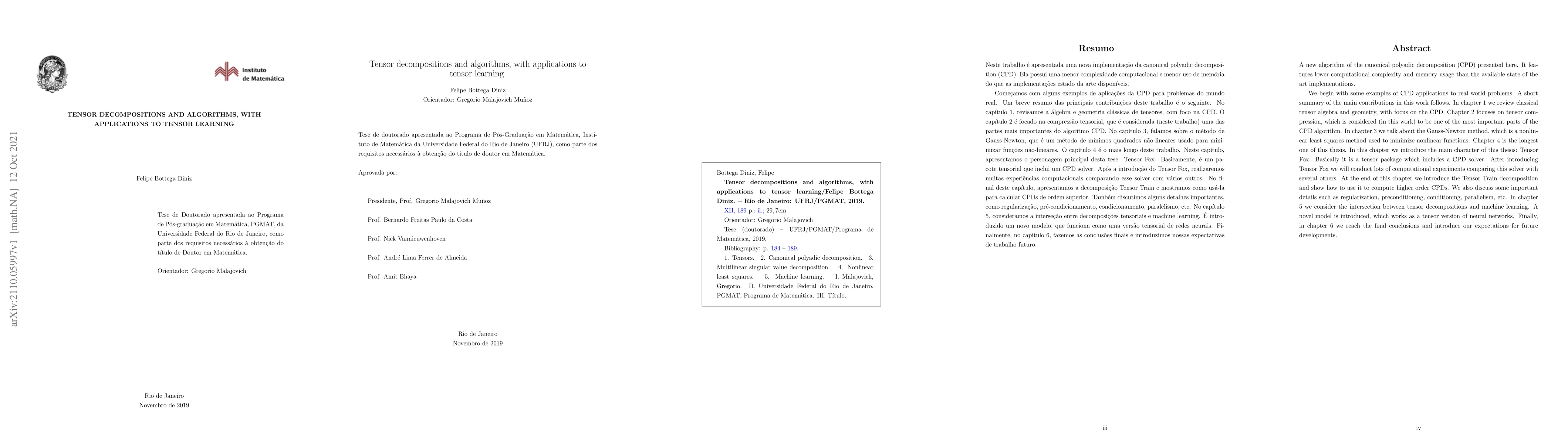 A new algorithm of the canonical polyadic decomposition (CPD) presented here. It features lower computational complexity and memory usage than the available state of the art implementations. We begin with some examples of CPD applications to real world problems. A short summary of the main contributions in this work follows. In chapter 1 we review classical tensor algebra and geometry, with focus on the CPD. Chapter 2 focuses on tensor compression, which is considered (in this work) to be one of the most important parts of the CPD algorithm. In chapter 3 we talk about the Gauss-Newton method, which is a nonlinear least squares method used to minimize nonlinear functions. Chapter 4 is the longest one of this thesis. In this chapter we introduce the main character of this thesis: Tensor Fox. Basically it is a tensor package which includes a CPD solver. After introducing Tensor Fox we will conduct lots of computational experiments comparing this solver with several others. At the end of this chapter we introduce the Tensor Train decomposition and show how to use it to compute higher order CPDs. We also discuss some important details such as regularization, preconditioning, conditioning, parallelism, etc. In chapter 5 we consider the intersection between tensor decompositions and machine learning. A novel model is introduced, which works as a tensor version of neural networks. Finally, in chapter 6 we reach the final conclusions and introduce our expectations for future developments.