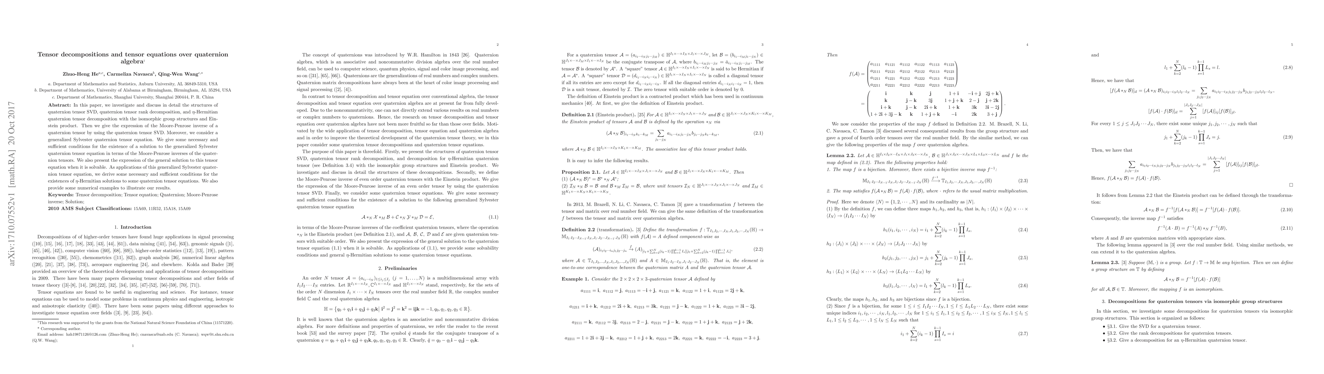 This paper explores tensor decompositions and equations over quaternion algebra, focusing on quaternion tensor SVD, rank decomposition, and $\eta$-Hermitian decomposition. It derives the Moore-Penrose inverse of a quaternion tensor and provides conditions for the existence of solutions to a generalized Sylvester quaternion tensor equation, along with numerical examples to demonstrate the findings.