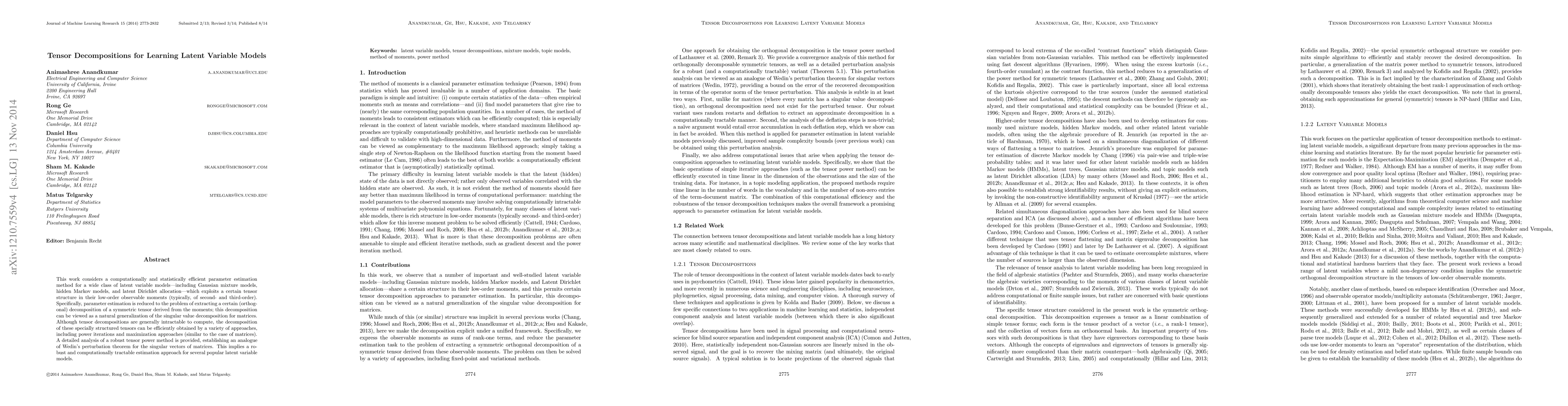 This work considers a computationally and statistically efficient parameter estimation method for a wide class of latent variable models---including Gaussian mixture models, hidden Markov models, and latent Dirichlet allocation---which exploits a certain tensor structure in their low-order observable moments (typically, of second- and third-order). Specifically, parameter estimation is reduced to the problem of extracting a certain (orthogonal) decomposition of a symmetric tensor derived from the moments; this decomposition can be viewed as a natural generalization of the singular value decomposition for matrices. Although tensor decompositions are generally intractable to compute, the decomposition of these specially structured tensors can be efficiently obtained by a variety of approaches, including power iterations and maximization approaches (similar to the case of matrices). A detailed analysis of a robust tensor power method is provided, establishing an analogue of Wedin's perturbation theorem for the singular vectors of matrices. This implies a robust and computationally tractable estimation approach for several popular latent variable models.