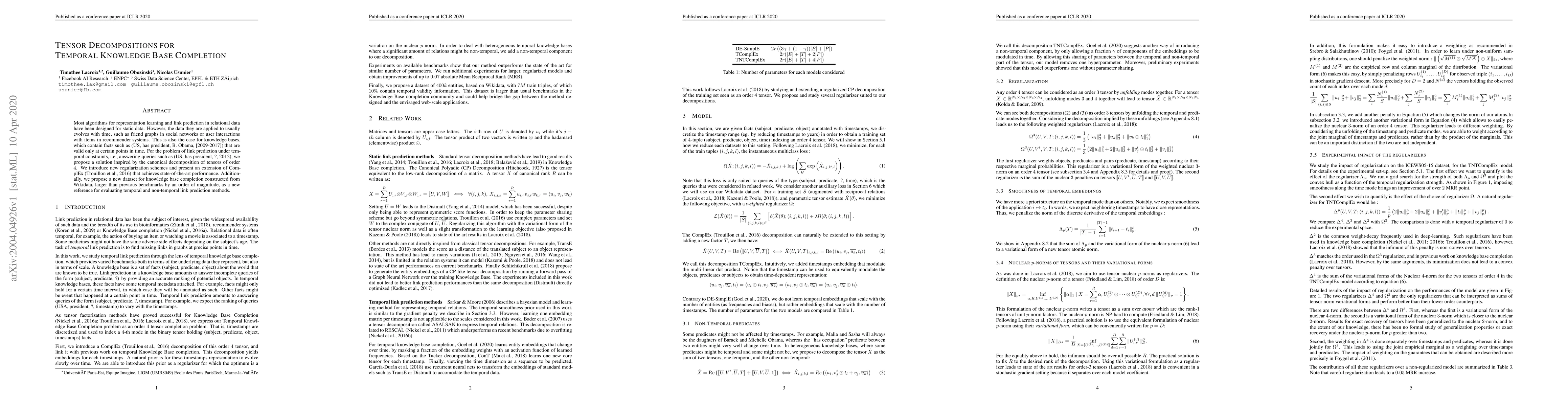 This paper proposes a tensor decomposition method for temporal knowledge base completion, addressing the evolving nature of relational data over time. It introduces new regularization schemes and a ComplEx extension to achieve state-of-the-art performance in link prediction under temporal constraints, and presents a significantly larger dataset from Wikidata for evaluation.