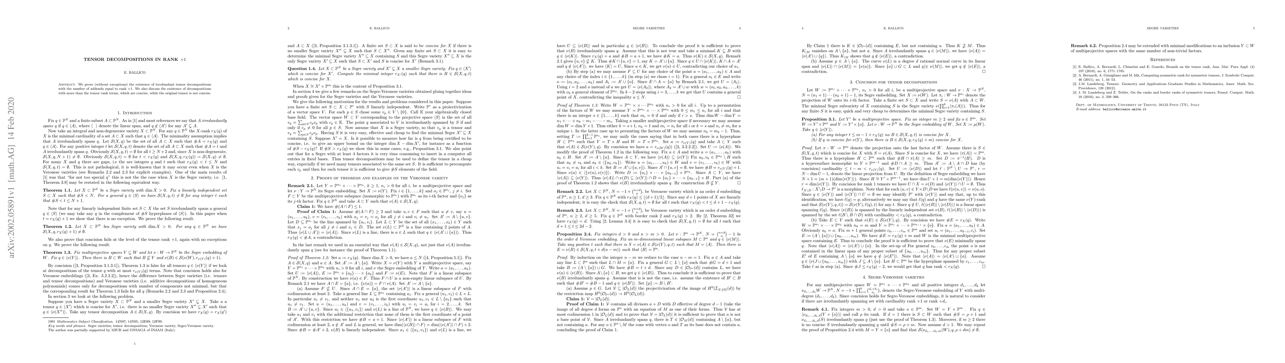 Summary: This paper proves the existence of irredundant tensor decompositions where the number of terms equals the tensor rank plus one, without exceptions. It also explores the possibility of more terms in concise decompositions that do not apply to the original tensor.