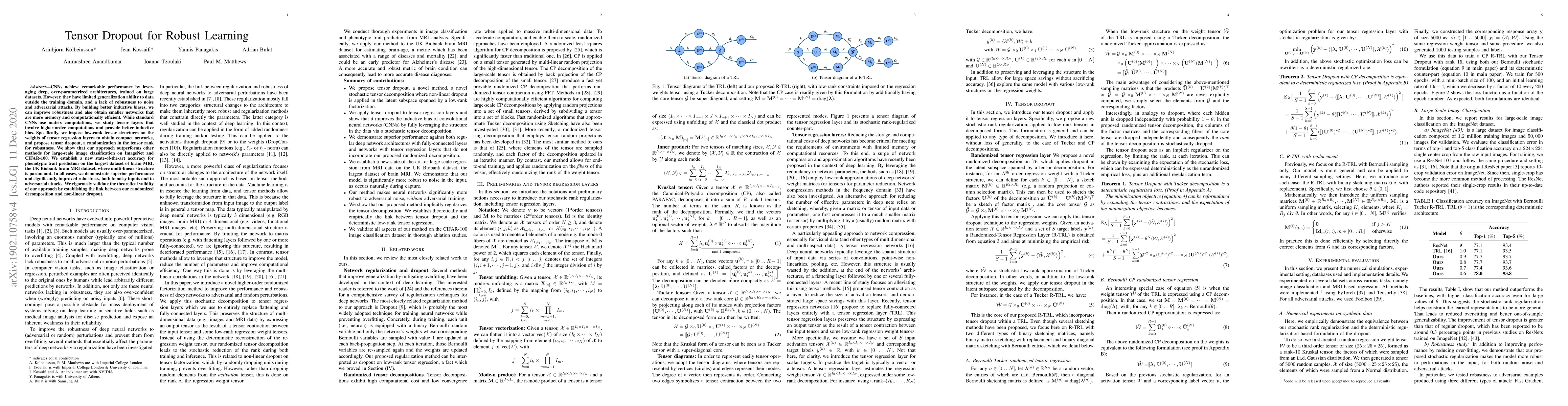 CNNs achieve remarkable performance by leveraging deep, over-parametrized architectures, trained on large datasets. However, they have limited generalization ability to data outside the training domain, and a lack of robustness to noise and adversarial attacks. By building better inductive biases, we can improve robustness and also obtain smaller networks that are more memory and computationally efficient. While standard CNNs use matrix computations, we study tensor layers that involve higher-order computations and provide better inductive bias. Specifically, we impose low-rank tensor structures on the weights of tensor regression layers to obtain compact networks, and propose tensor dropout, a randomization in the tensor rank for robustness. We show that our approach outperforms other methods for large-scale image classification on ImageNet and CIFAR-100. We establish a new state-of-the-art accuracy for phenotypic trait prediction on the largest dataset of brain MRI, the UK Biobank brain MRI dataset, where multi-linear structure is paramount. In all cases, we demonstrate superior performance and significantly improved robustness, both to noisy inputs and to adversarial attacks. We rigorously validate the theoretical validity of our approach by establishing the link between our randomized decomposition and non-linear dropout.