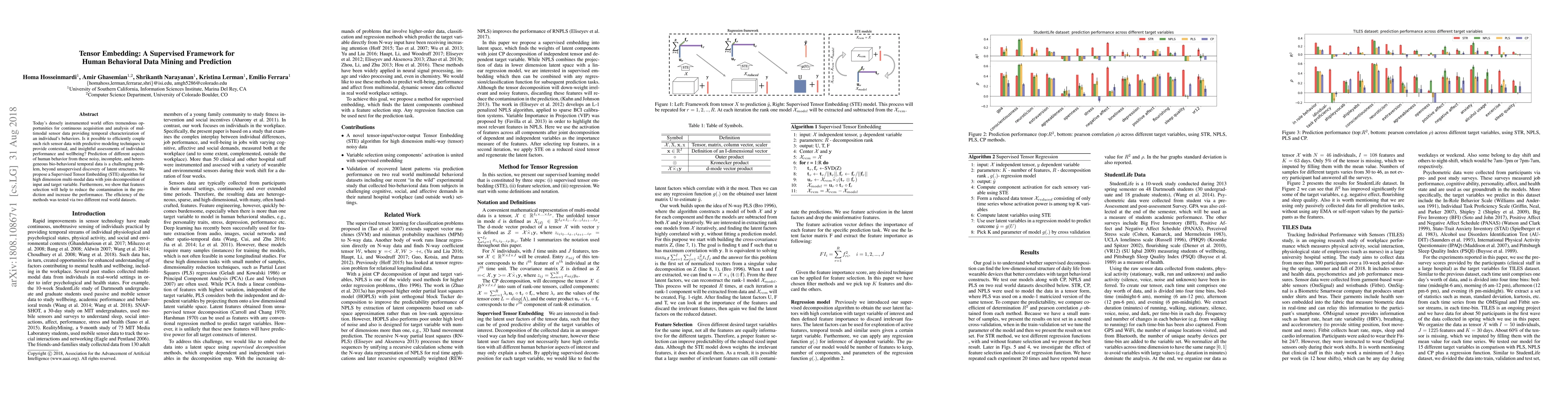 The paper proposes a Supervised Tensor Embedding (STE) algorithm to predict human behavior from multimodal sensor data, utilizing joint decomposition to enhance performance. Feature selection is shown to reduce contamination and improve prediction accuracy, validated through real-world datasets.