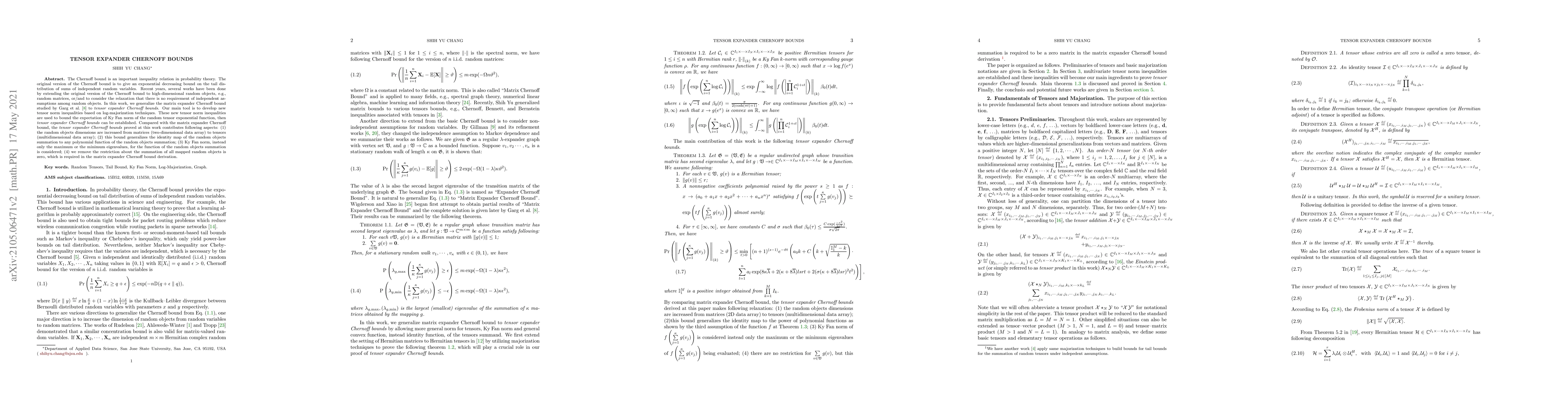 This paper generalizes the matrix expander Chernoff bound to tensor expander Chernoff bounds, employing new tensor norm inequalities derived from log-majorization techniques. The work extends the dimensions of random objects from matrices to tensors and relaxes several assumptions, providing a more flexible and comprehensive bound.