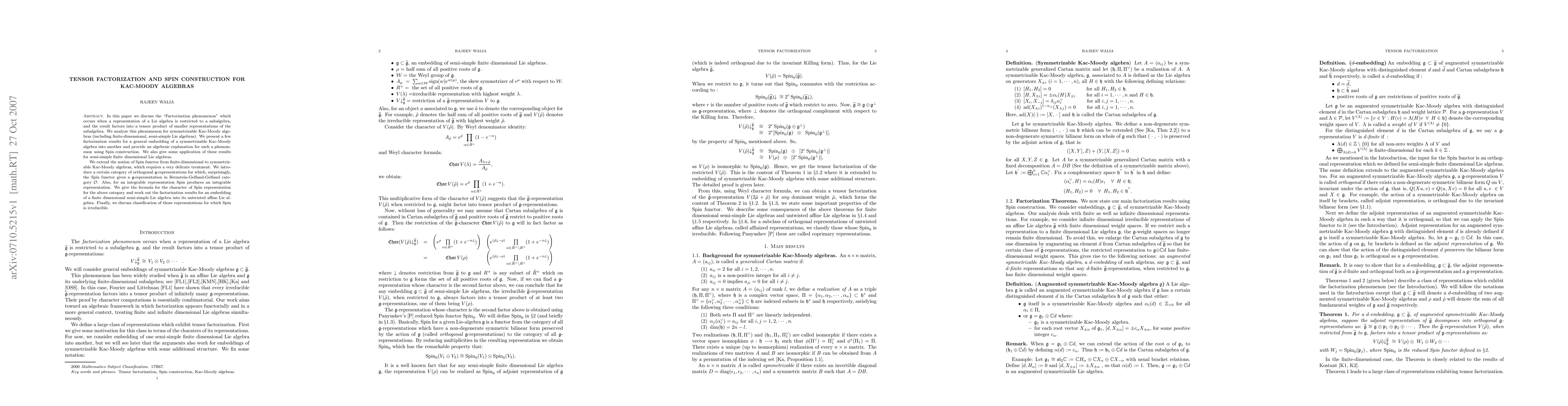 This paper explores the "Factorization phenomenon" in representations of symmetrizable Kac-Moody algebras, extending the Spin functor and providing algebraic explanations using Spin construction. It details factorization results for embeddings and discusses applications to semi-simple finite-dimensional Lie algebras, including character formulas for Spin representations.