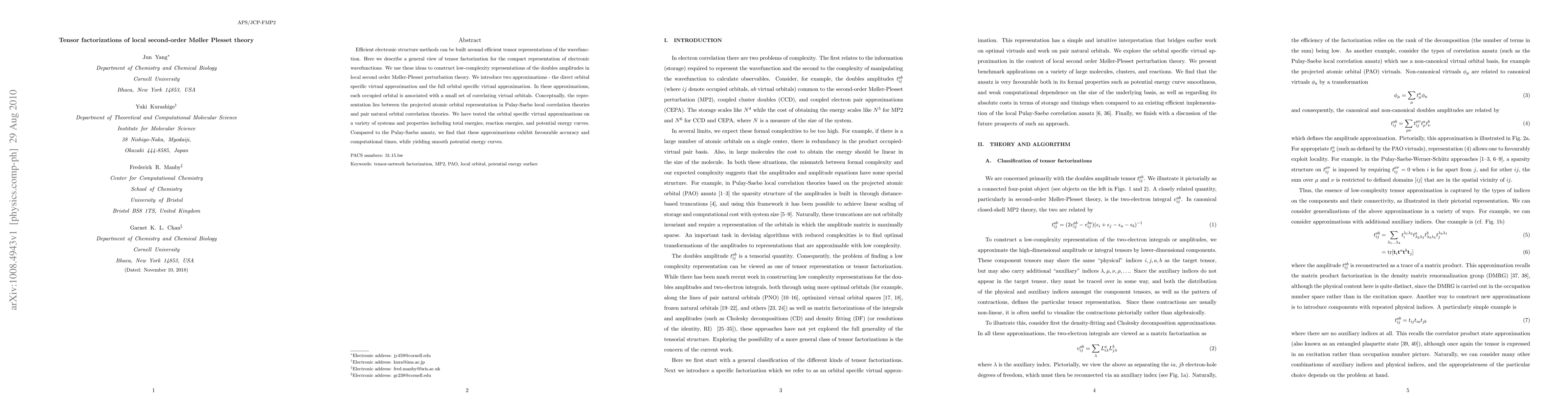 This paper proposes tensor factorization methods for compactly representing electronic wavefunctions in local second-order M{\o}ller-Plesset perturbation theory, introducing two new orbital-specific virtual approximations that show improved accuracy and computational efficiency compared to existing methods.