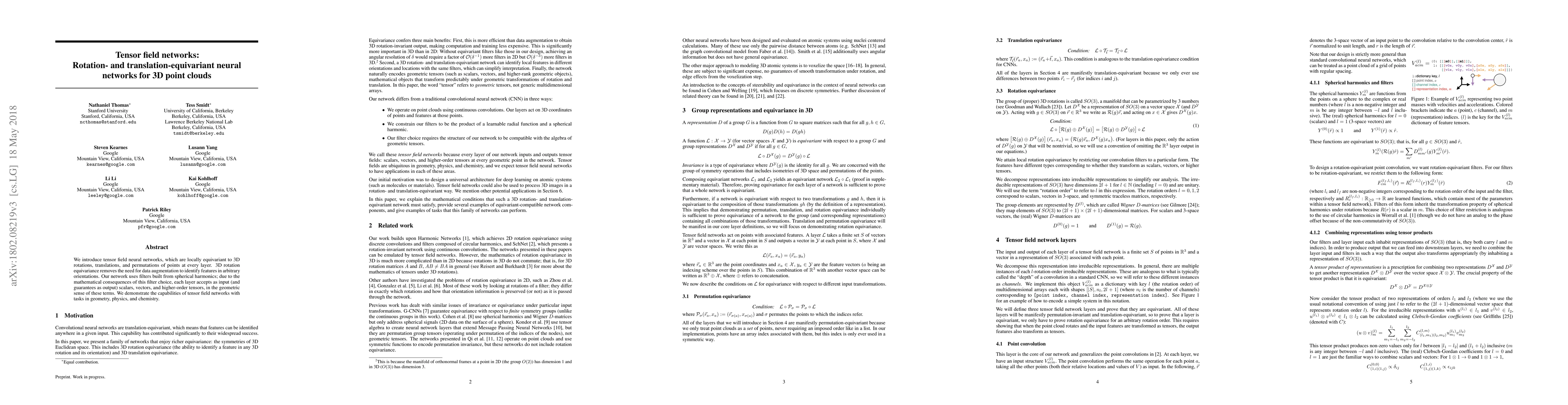 We introduce tensor field neural networks, which are locally equivariant to 3D rotations, translations, and permutations of points at every layer. 3D rotation equivariance removes the need for data augmentation to identify features in arbitrary orientations. Our network uses filters built from spherical harmonics; due to the mathematical consequences of this filter choice, each layer accepts as input (and guarantees as output) scalars, vectors, and higher-order tensors, in the geometric sense of these terms. We demonstrate the capabilities of tensor field networks with tasks in geometry, physics, and chemistry.