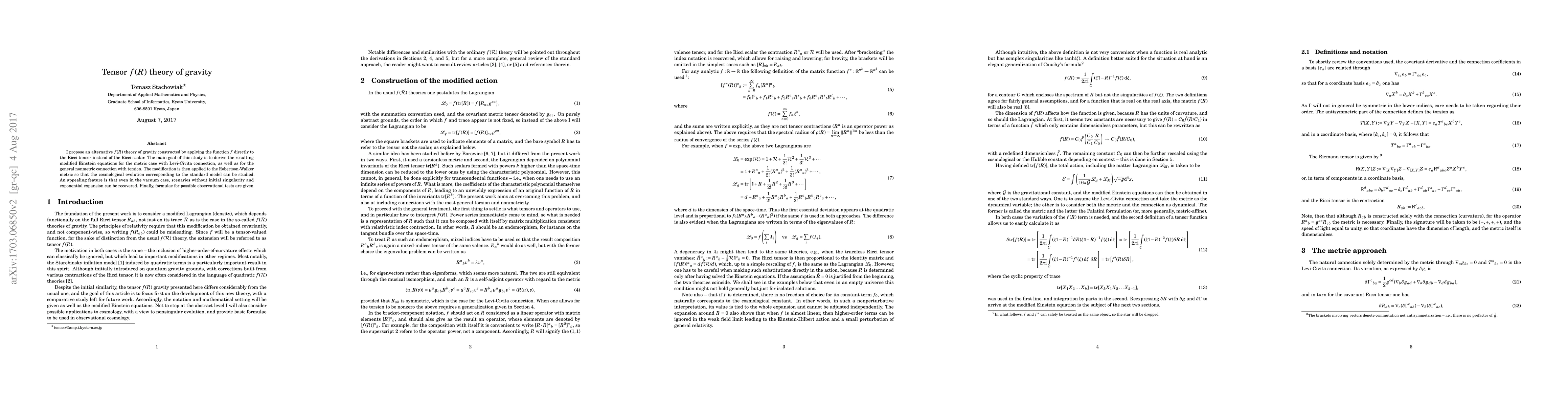 I propose an alternative $f(R)$ theory of gravity constructed by applying the function $f$ directly to the Ricci tensor instead of the Ricci scalar. The main goal of this study is to derive the resulting modified Einstein equations for the metric case with Levi-Civita connection, as well as for the general nonmetric connection with torsion. The modification is then applied to the Robertson-Walker metric so that the cosmological evolution corresponding to the standard model can be studied. An appealing feature is that even in the vacuum case, scenarios without initial singularity and exponential expansion can be recovered. Finally, formulae for possible observational tests are given.