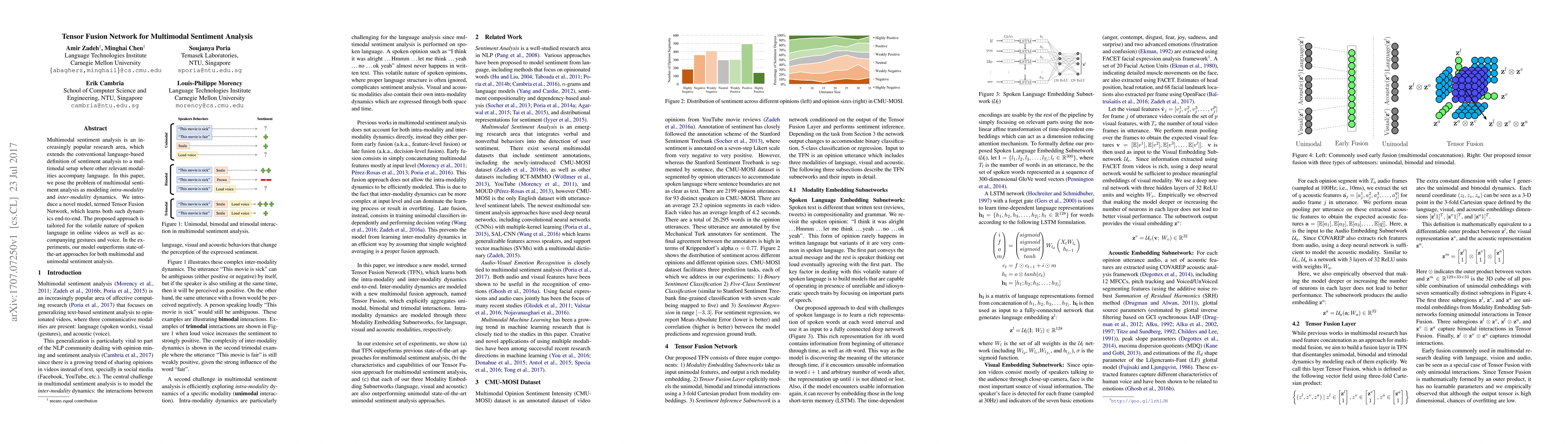 Multimodal sentiment analysis is an increasingly popular research area, which extends the conventional language-based definition of sentiment analysis to a multimodal setup where other relevant modalities accompany language. In this paper, we pose the problem of multimodal sentiment analysis as modeling intra-modality and inter-modality dynamics. We introduce a novel model, termed Tensor Fusion Network, which learns both such dynamics end-to-end. The proposed approach is tailored for the volatile nature of spoken language in online videos as well as accompanying gestures and voice. In the experiments, our model outperforms state-of-the-art approaches for both multimodal and unimodal sentiment analysis.