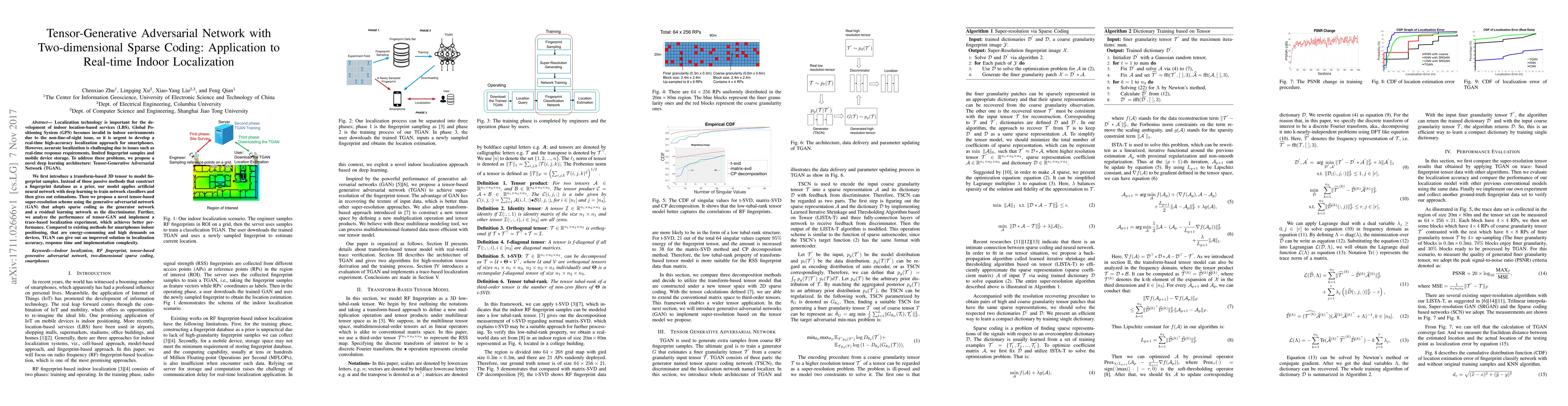 This paper proposes a Tensor-Generative Adversarial Network (TGAN) for real-time indoor localization, addressing the limitations of GPS in indoor environments. The TGAN model uses a 3D tensor to model fingerprint samples and employs a generative adversarial network with sparse coding and residual learning for improved localization accuracy, response time, and lower implementation complexity compared to existing methods.