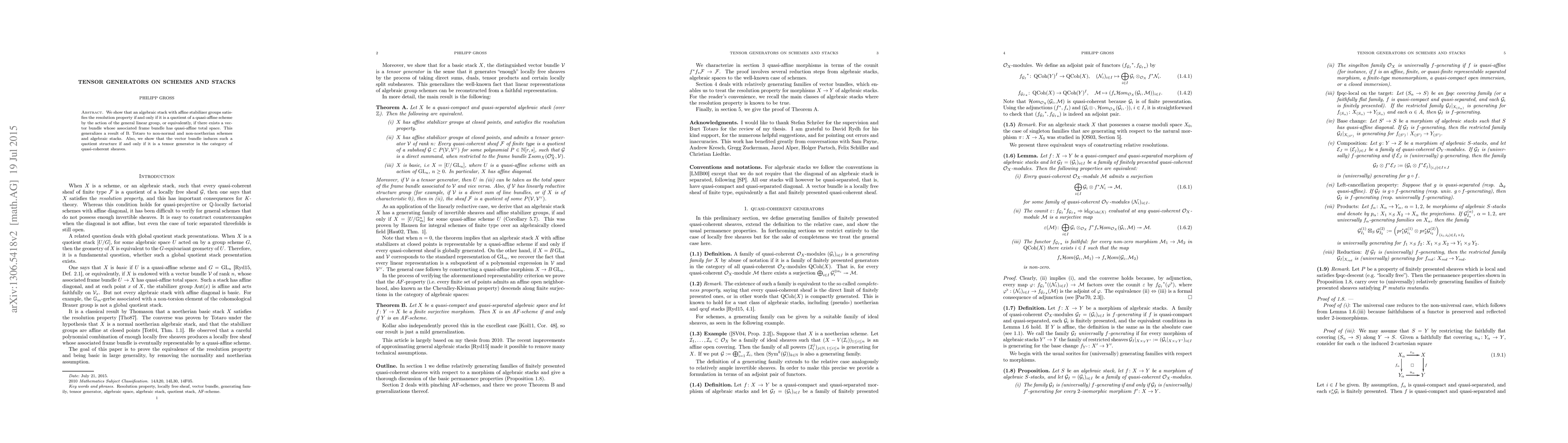 We show that an algebraic stack with affine stabilizer groups satisfies the resolution property if and only if it is a quotient of a quasi-affine scheme by the action of the general linear group, or equivalently, if there exists a vector bundle whose associated frame bundle has quasi-affine total space. This generalizes a result of B. Totaro to non-normal and non-noetherian schemes and algebraic stacks. Also, we show that the vector bundle induces such a quotient structure if and only if it is a tensor generator in the category of quasi-coherent sheaves.