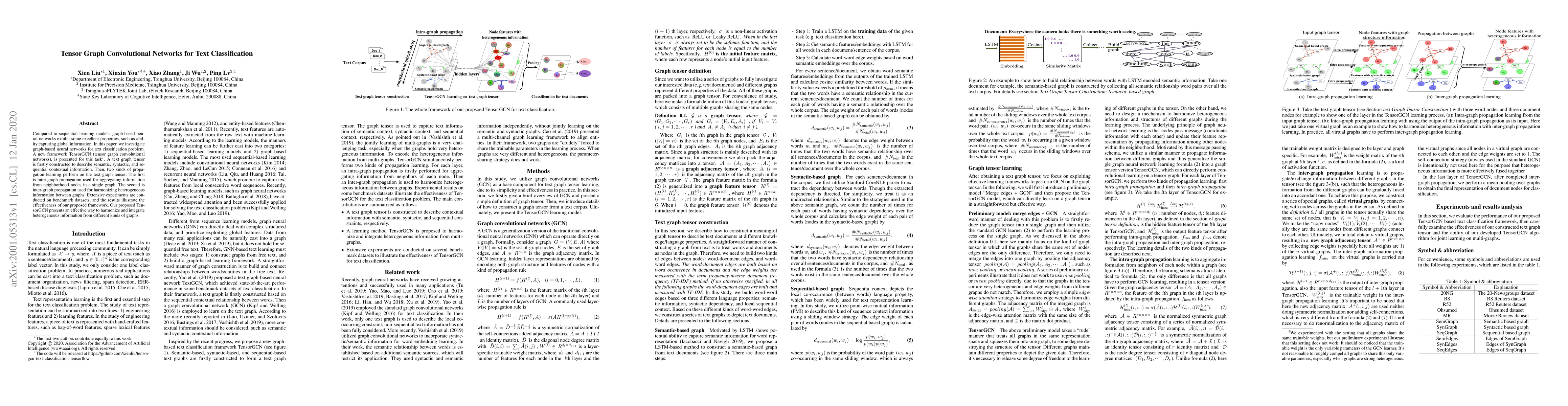This paper introduces TensorGCN, a novel framework for text classification that leverages graph-based neural networks to capture global information. It constructs a text graph tensor to integrate semantic, syntactic, and contextual information, employing intra-graph and inter-graph propagation learning to harmonize heterogeneous data, demonstrating improved performance on benchmark datasets.