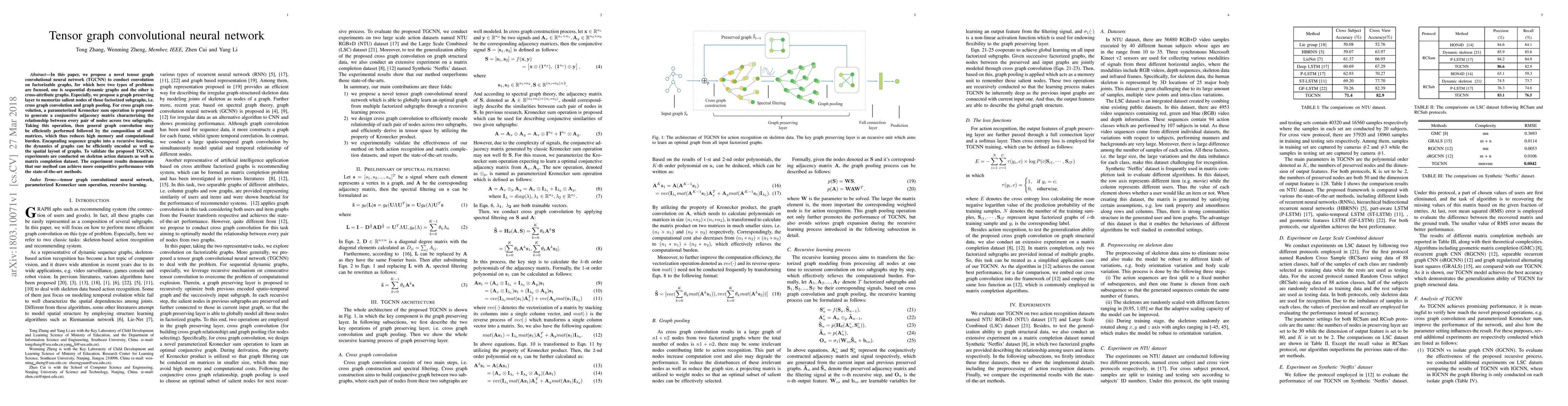 In this paper, we propose a novel tensor graph convolutional neural network (TGCNN) to conduct convolution on factorizable graphs, for which here two types of problems are focused, one is sequential dynamic graphs and the other is cross-attribute graphs. Especially, we propose a graph preserving layer to memorize salient nodes of those factorized subgraphs, i.e. cross graph convolution and graph pooling. For cross graph convolution, a parameterized Kronecker sum operation is proposed to generate a conjunctive adjacency matrix characterizing the relationship between every pair of nodes across two subgraphs. Taking this operation, then general graph convolution may be efficiently performed followed by the composition of small matrices, which thus reduces high memory and computational burden. Encapsuling sequence graphs into a recursive learning, the dynamics of graphs can be efficiently encoded as well as the spatial layout of graphs. To validate the proposed TGCNN, experiments are conducted on skeleton action datasets as well as matrix completion dataset. The experiment results demonstrate that our method can achieve more competitive performance with the state-of-the-art methods.
