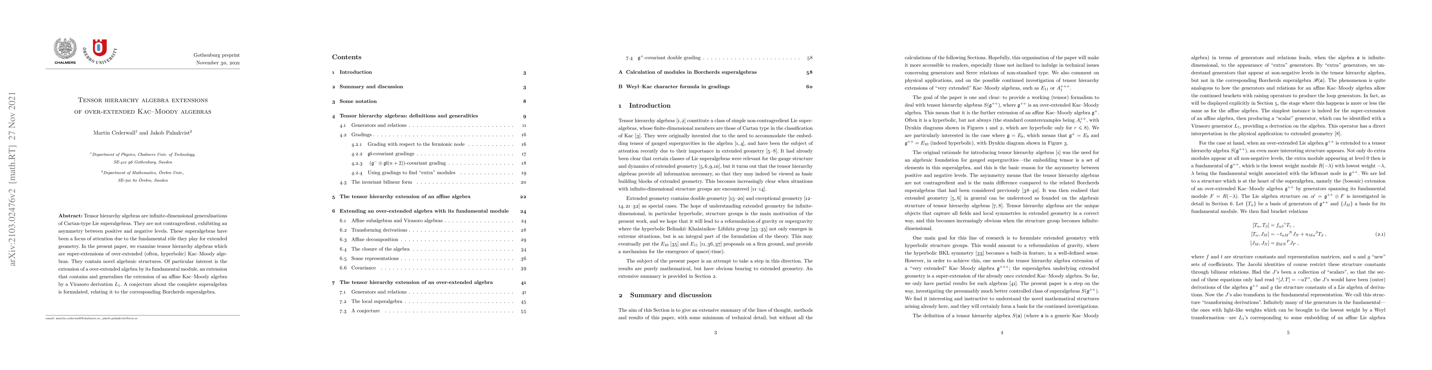 Tensor hierarchy algebras are infinite-dimensional generalisations of Cartan-type Lie superalgebras. They are not contragredient, exhibiting an asymmetry between positive and negative levels. These superalgebras have been a focus of attention due to the fundamental role they play for extended geometry. In the present paper, we examine tensor hierarchy algebras which are super-extensions of over-extended (often, hyperbolic) Kac--Moody algebras. They contain novel algebraic structures. Of particular interest is the extension of a over-extended algebra by its fundamental module, an extension that contains and generalises the extension of an affine Kac--Moody algebra by a Virasoro derivation $L_1$. A conjecture about the complete superalgebra is formulated, relating it to the corresponding Borcherds superalgebra.
