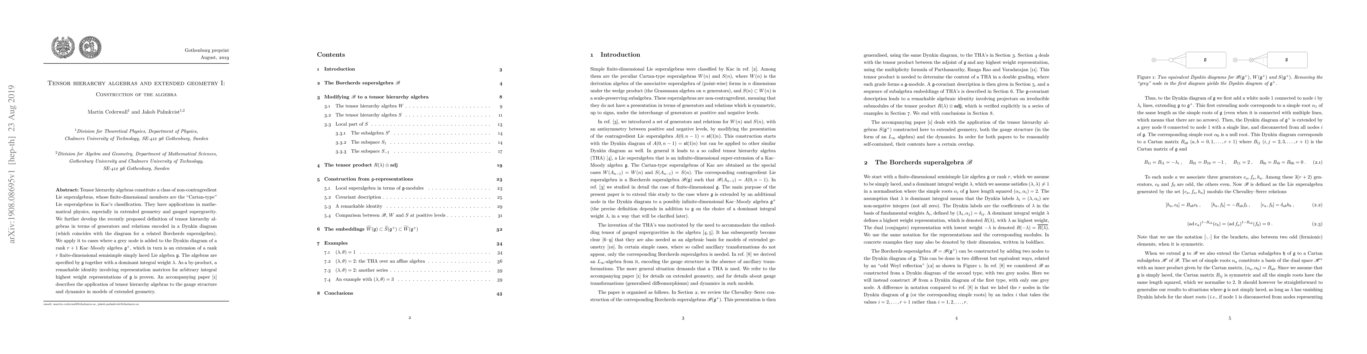 Tensor hierarchy algebras constitute a class of non-contragredient Lie superalgebras, whose finite-dimensional members are the "Cartan-type" Lie superalgebras in Kac's classification. They have applications in mathematical physics, especially in extended geometry and gauged supergravity. We further develop the recently proposed definition of tensor hierarchy algebras in terms of generators and relations encoded in a Dynkin diagram (which coincides with the diagram for a related Borcherds superalgebra). We apply it to cases where a grey node is added to the Dynkin diagram of a rank $r+1$ Kac-Moody algebra $\mathfrak{g}^+$, which in turn is an extension of a rank $r$ finite-dimensional semisimple simply laced Lie algebra $\mathfrak{g}$. The algebras are specified by $\mathfrak{g}$ together with a dominant integral weight $\lambda$. As a by-product, a remarkable identity involving representation matrices for arbitrary integral highest weight representations of $\mathfrak{g}$ is proven. An accompanying paper describes the application of tensor hierarchy algebras to the gauge structure and dynamics in models of extended geometry.