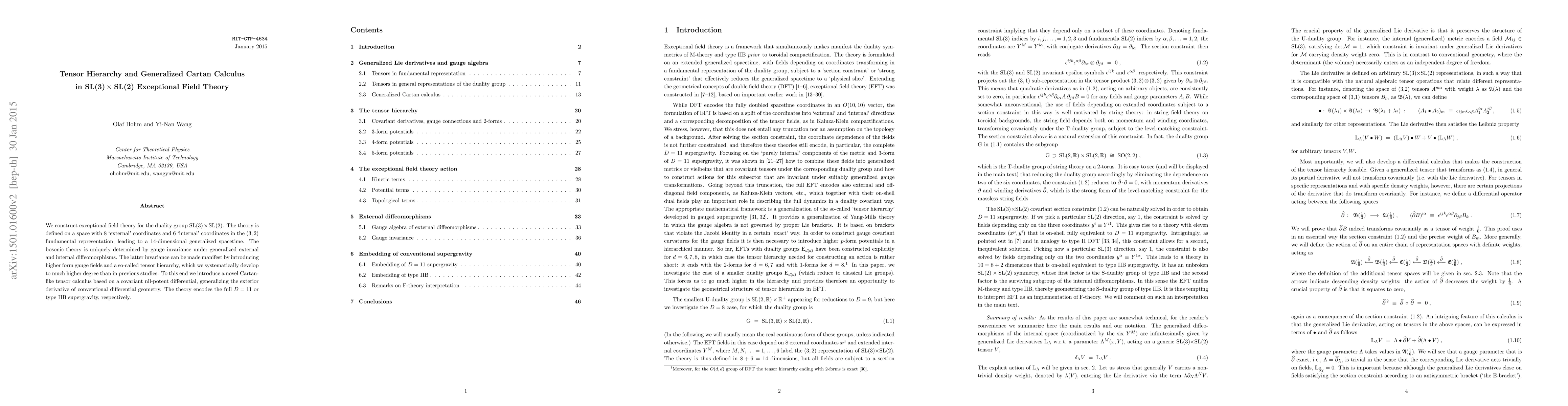 We construct exceptional field theory for the duality group SL(3)$\times$SL(2). The theory is defined on a space with 8 `external' coordinates and 6 `internal' coordinates in the $(3,2)$ fundamental representation, leading to a 14-dimensional generalized spacetime. The bosonic theory is uniquely determined by gauge invariance under generalized external and internal diffeomorphisms. The latter invariance can be made manifest by introducing higher form gauge fields and a so-called tensor hierarchy, which we systematically develop to much higher degree than in previous studies. To this end we introduce a novel Cartan-like tensor calculus based on a covariant nil-potent differential, generalizing the exterior derivative of conventional differential geometry. The theory encodes the full $D=11$ or type IIB supergravity, respectively.