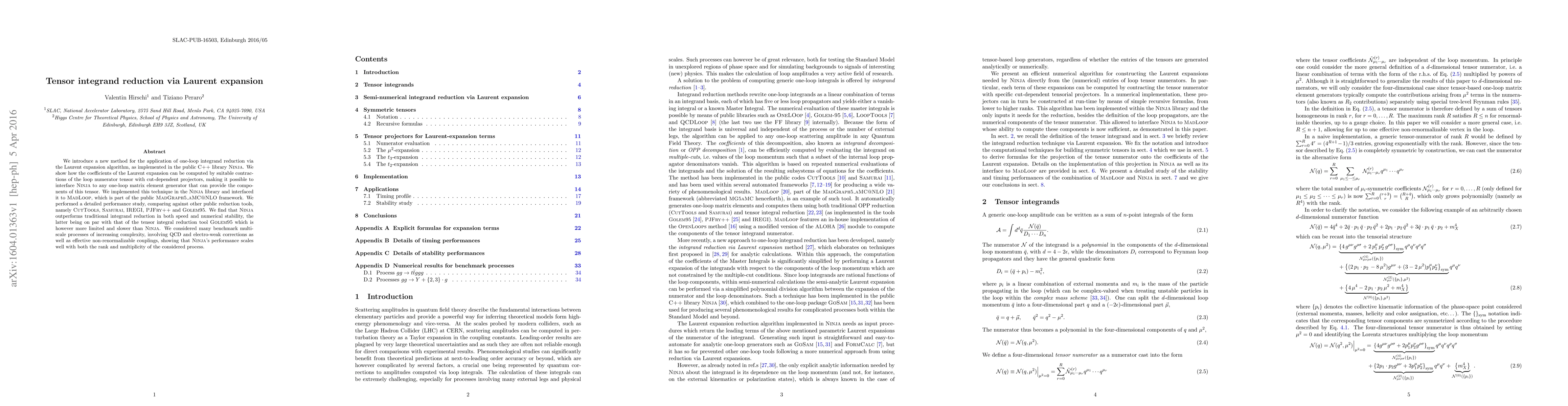 We introduce a new method for the application of one-loop integrand reduction via the Laurent expansion algorithm, as implemented in the public C++ library Ninja. We show how the coefficients of the Laurent expansion can be computed by suitable contractions of the loop numerator tensor with cut-dependent projectors, making it possible to interface Ninja to any one-loop matrix element generator that can provide the components of this tensor. We implemented this technique in the Ninja library and interfaced it to MadLoop, which is part of the public MadGraph5_aMC@NLO framework. We performed a detailed performance study, comparing against other public reduction tools, namely CutTools, Samurai, IREGI, PJFry++ and Golem. We find that Ninja outperforms traditional integrand reduction in both speed and numerical stability, the latter being on par with that of the tensor integral reduction tool Golem which is however more limited and slower than Ninja. We considered many benchmark multi-scale processes of increasing complexity, involving QCD and electro-weak corrections as well as effective non-renormalizable couplings, showing that Ninja's performance scales well with both the rank and multiplicity of the considered process.