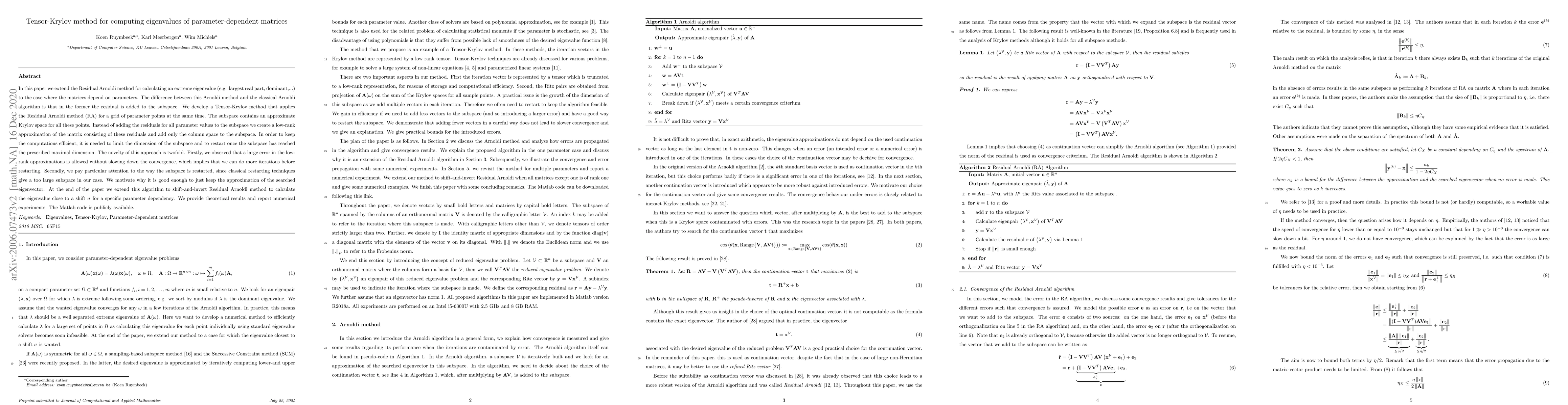 This paper introduces a Tensor-Krylov method for computing extreme eigenvalues of parameter-dependent matrices by extending the Residual Arnoldi method. It efficiently handles multiple parameter points using low-rank approximations and innovative subspace restarting techniques, allowing more iterations before restarting and providing theoretical results and numerical experiments.