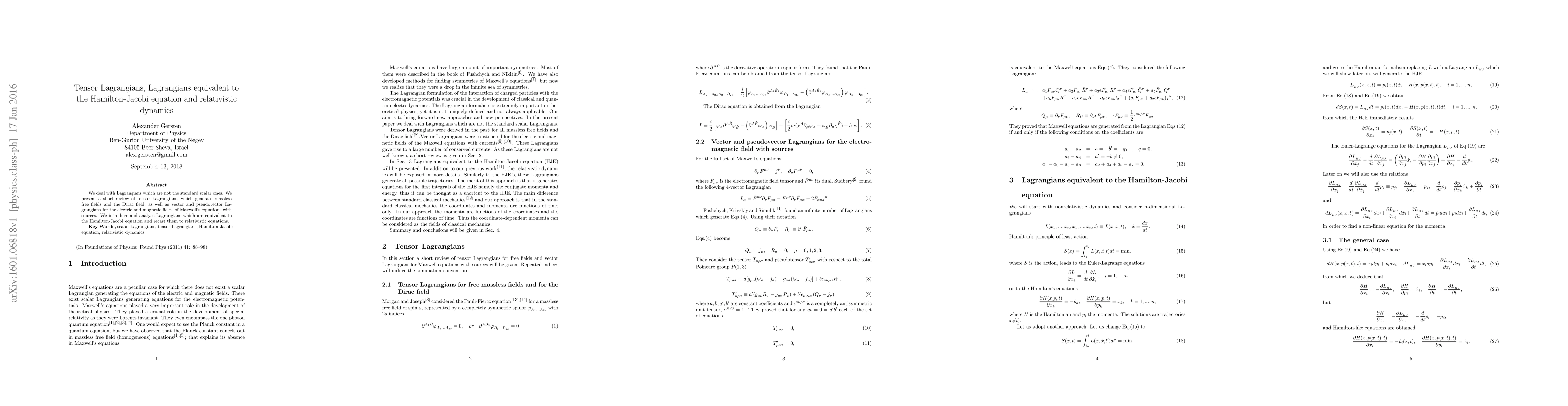 This paper reviews tensor Lagrangians that generate various fields, including massless fields and the Dirac field, and examines Lagrangians equivalent to the Hamilton-Jacobi equation, reformulating them in a relativistic context.