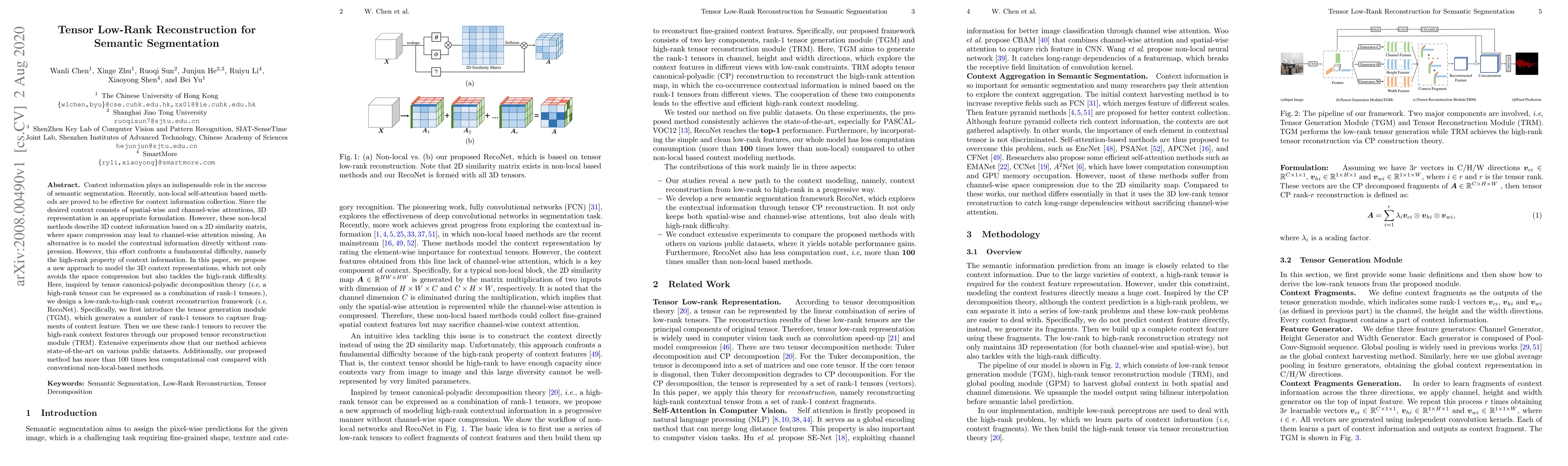 This paper proposes a tensor low-rank reconstruction framework (RecoNet) for semantic segmentation that captures 3D context information by using tensor canonical-polyadic decomposition to generate rank-1 tensors, which are then combined to reconstruct high-rank context features, achieving state-of-the-art performance with significantly lower computational cost.