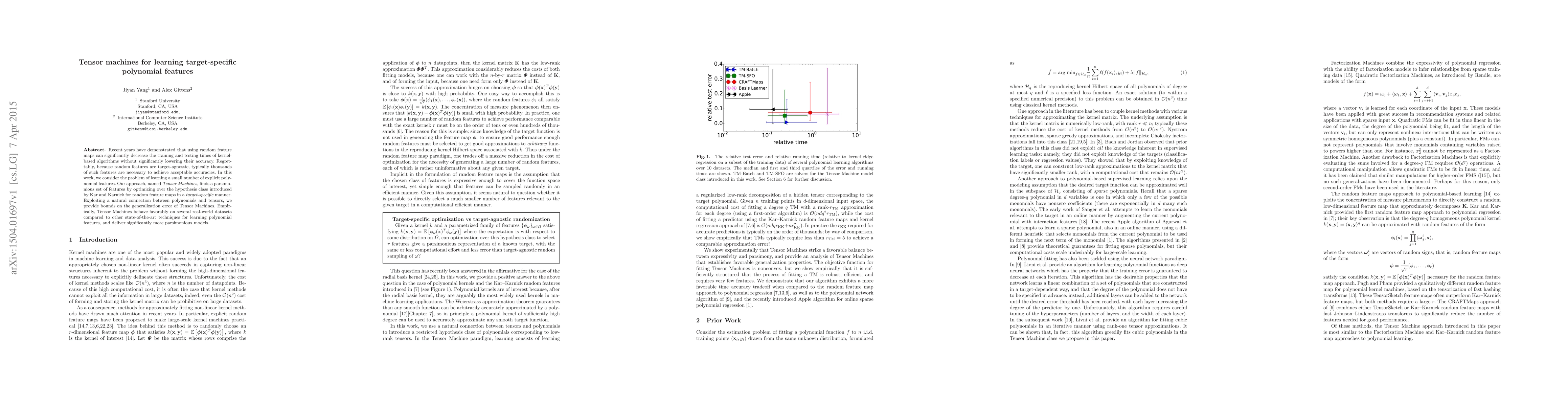 Recent years have demonstrated that using random feature maps can significantly decrease the training and testing times of kernel-based algorithms without significantly lowering their accuracy. Regrettably, because random features are target-agnostic, typically thousands of such features are necessary to achieve acceptable accuracies. In this work, we consider the problem of learning a small number of explicit polynomial features. Our approach, named Tensor Machines, finds a parsimonious set of features by optimizing over the hypothesis class introduced by Kar and Karnick for random feature maps in a target-specific manner. Exploiting a natural connection between polynomials and tensors, we provide bounds on the generalization error of Tensor Machines. Empirically, Tensor Machines behave favorably on several real-world datasets compared to other state-of-the-art techniques for learning polynomial features, and deliver significantly more parsimonious models.