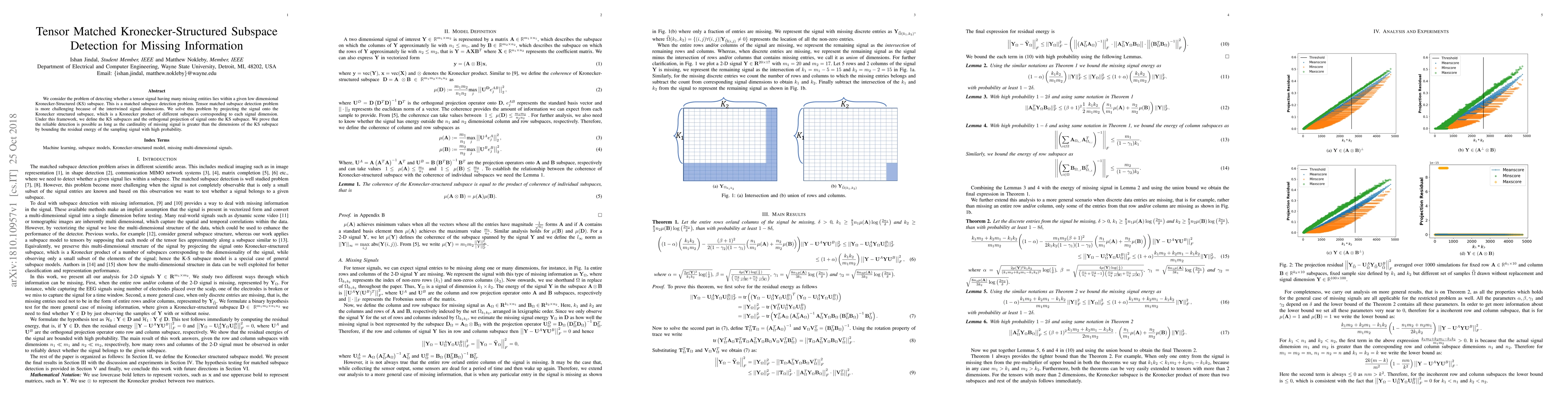 This paper addresses the challenge of detecting tensor signals with missing data within a low-dimensional Kronecker-Structured subspace. It projects the tensor onto a Kronecker product of subspaces and proves reliable detection is feasible if the number of missing entries exceeds the subspace dimensions, by bounding residual energy with high probability.