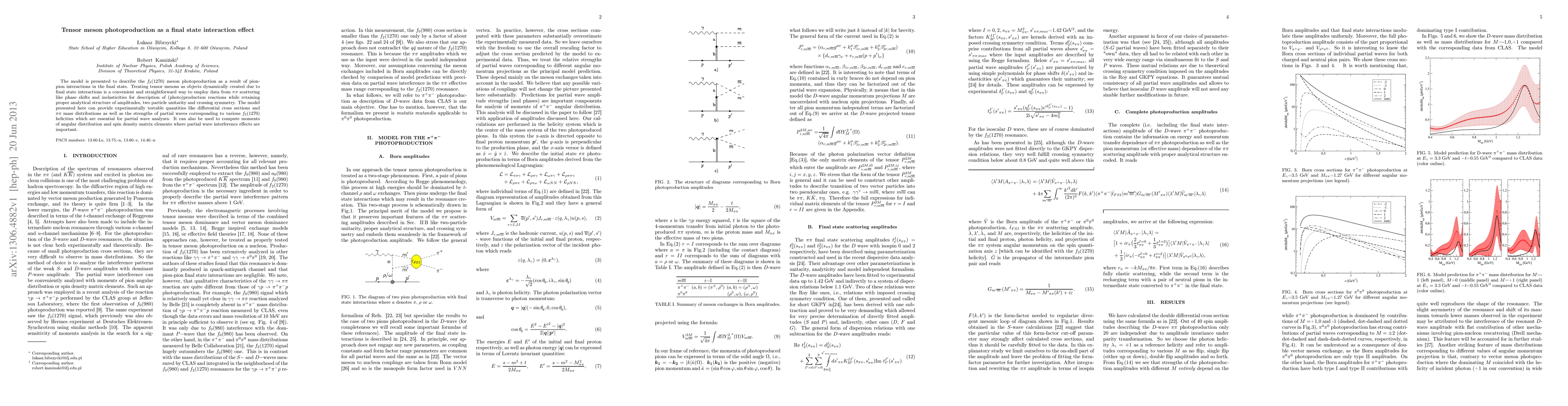 The model is presented to describe the f_2(1270) meson photoproduction as a result of pion-pion interactions in the final state. Treating tensor mesons as objects dynamically created due to final state interactions is a convenient and straightforward way to employ data from pi pi scattering like phase shifts and inelasticities for description of (photo)production reactions while retaining proper analytical structure of amplitudes, two particle unitarity and crossing symmetry. The model presented here can provide experimentally testable quantities like differential cross sections and pi pi mass distributions as well as the strengths of partial waves corresponding to various f_2(1270) helicities which are essential for partial wave analyses. It can also be used to compute moments of angular distribution and spin density matrix elements where partial wave interference effects are important.