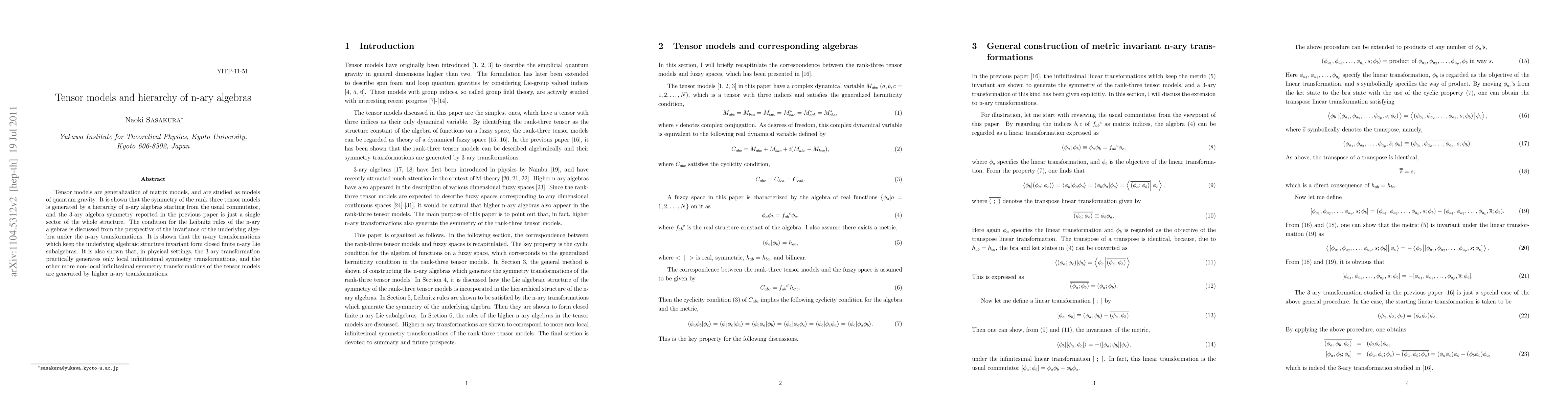 This paper explores tensor models as quantum gravity models, revealing that their symmetry is governed by a hierarchy of n-ary algebras, extending beyond the usual commutator. It demonstrates that 3-ary algebra symmetries are part of a broader structure, with n-ary transformations forming closed finite n-ary Lie subalgebras that preserve the underlying algebraic structure.