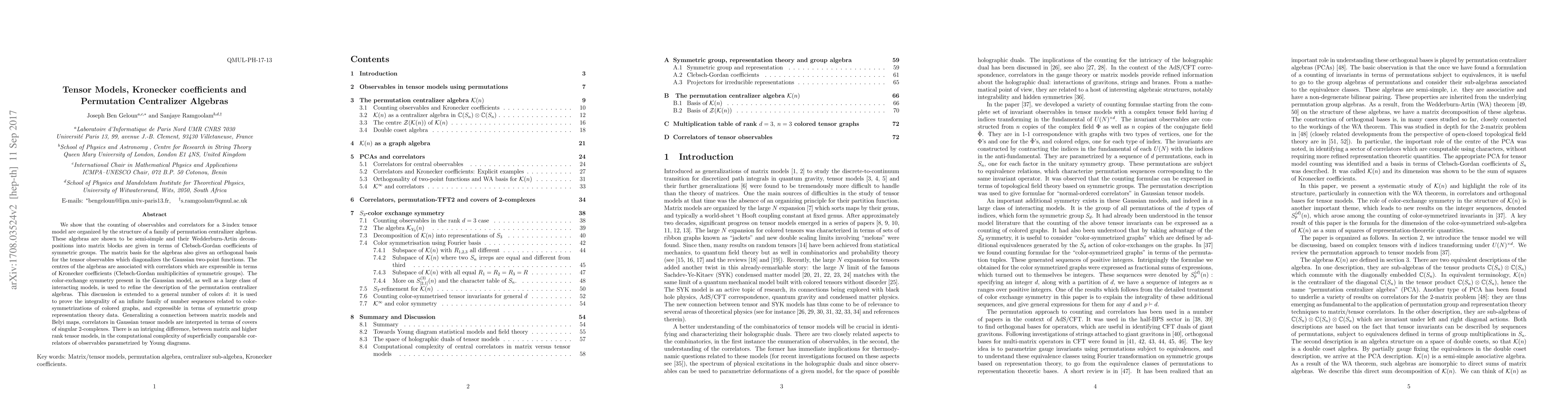 This paper demonstrates that tensor models' observables and correlators are structured by permutation centralizer algebras, which are semi-simple and decomposed into matrix blocks using symmetric group Clebsch-Gordan coefficients. Correlators are linked to Kronecker coefficients, and the color-exchange symmetry refines the algebra's description, proving integrality of sequences related to color-symmetrizations of colored graphs.