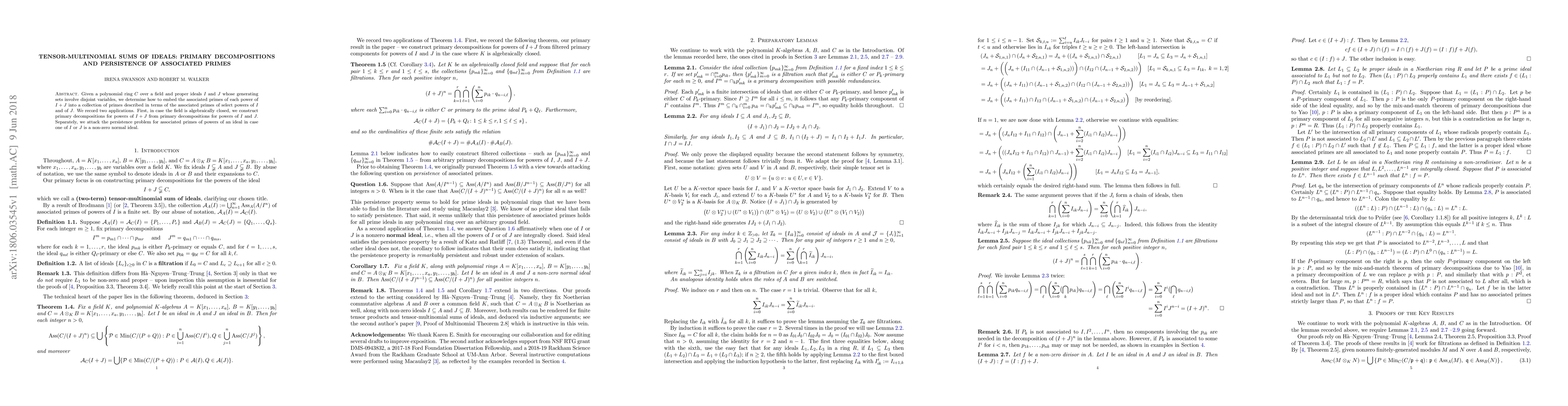 This paper explores tensor-multinomial sums of ideals in a polynomial ring over a field, focusing on embedding associated primes of $I+J$ into primes derived from select powers of $I$ and $J$. It provides primary decompositions for powers of $I+J$ when the field is algebraically closed and addresses the persistence of associated primes for one non-zero normal ideal.