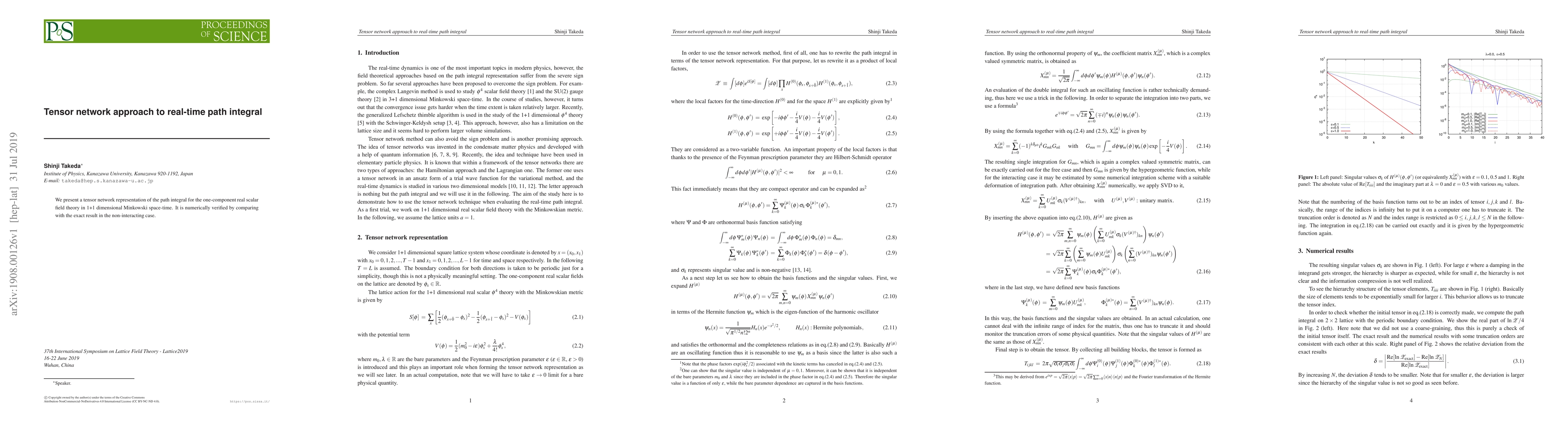 Summary: This paper introduces a tensor network method to represent the path integral for real scalar field theory in 1+1 dimensions, demonstrating its accuracy through numerical verification against exact results in the non-interacting scenario.