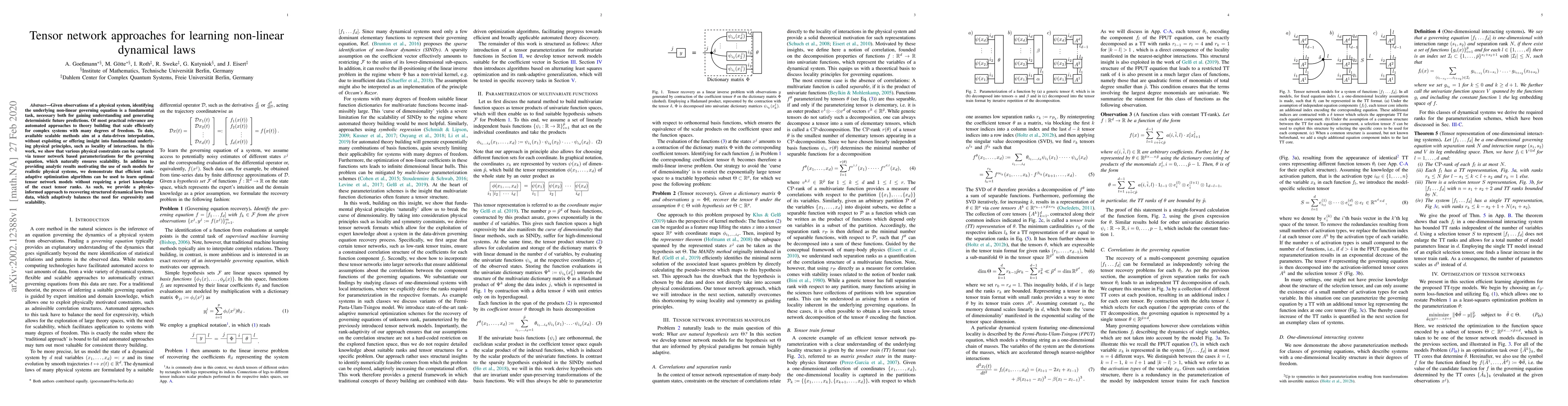 This research introduces tensor network methods to learn non-linear dynamical laws from physical system observations, incorporating physical constraints and ensuring scalability. It demonstrates that efficient optimization algorithms can adaptively determine optimal tensor network models, balancing expressivity and computational efficiency without prior tensor rank knowledge.