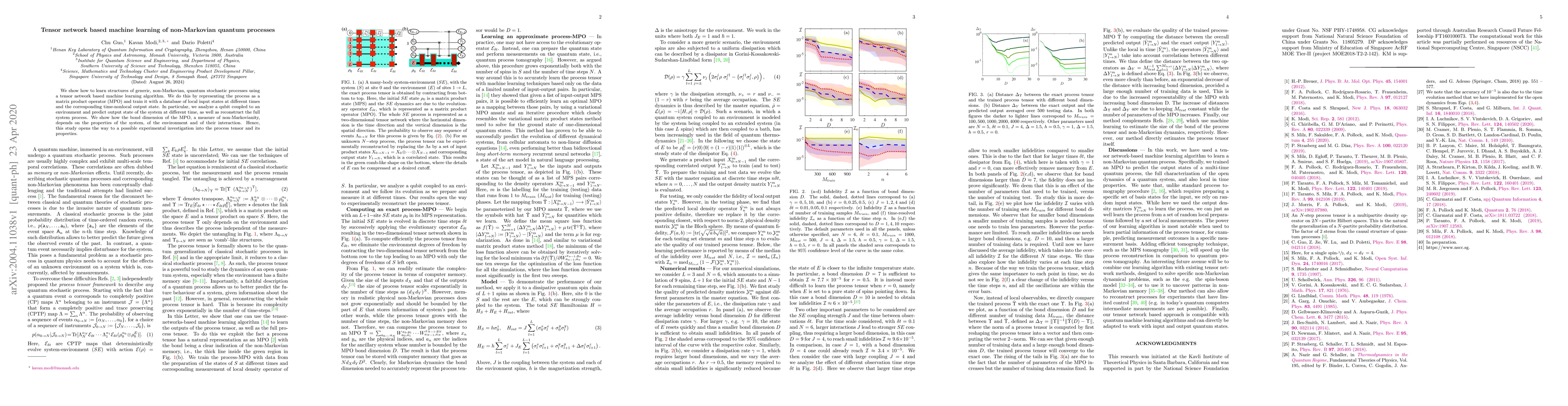 We show how to learn structures of generic, non-Markovian, quantum stochastic processes using a tensor network based machine learning algorithm. We do this by representing the process as a matrix product operator (MPO) and train it with a database of local input states at different times and the corresponding time-nonlocal output state. In particular, we analyze a qubit coupled to an environment and predict output state of the system at different time, as well as reconstruct the full system process. We show how the bond dimension of the MPO, a measure of non-Markovianity, depends on the properties of the system, of the environment and of their interaction. Hence, this study opens the way to a possible experimental investigation into the process tensor and its properties.