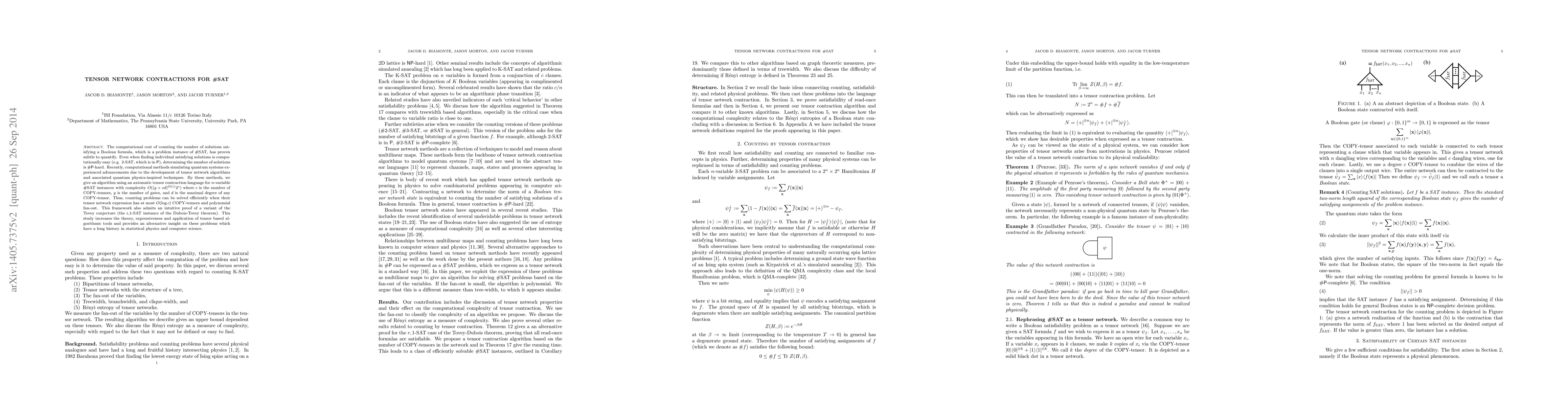 This paper introduces an algorithm for solving #SAT problems using tensor network contractions, achieving a complexity of O((g+cd)^{O(1)} 2^c), which can be efficient for instances with limited COPY-tensors and polynomial fan-out.