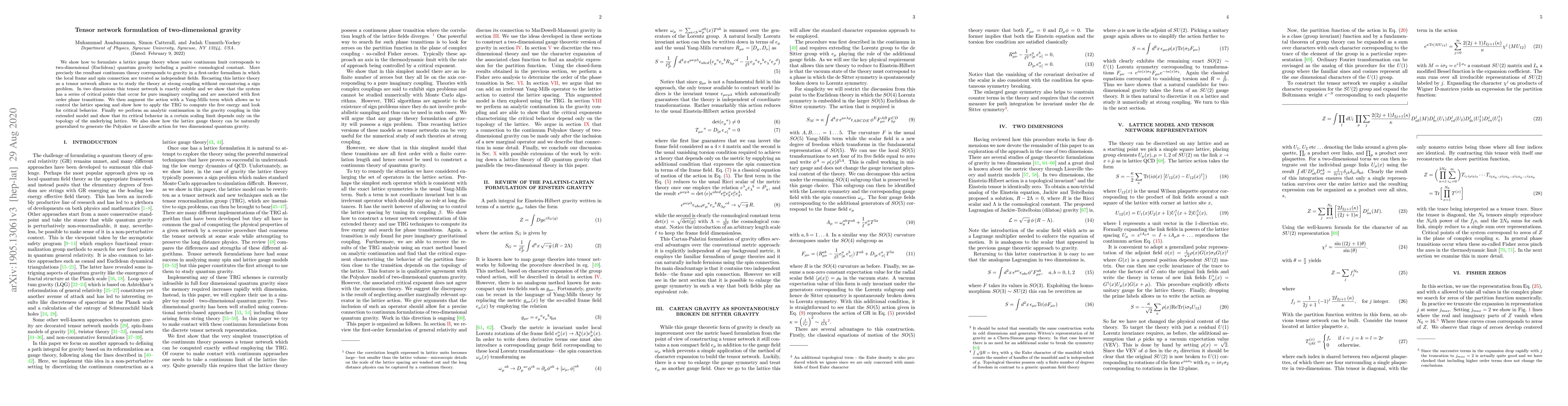 We show how to formulate a lattice gauge theory whose naive continuum limit corresponds to two-dimensional (Euclidean) quantum gravity including a positive cosmological constant. More precisely the resultant continuum theory corresponds to gravity in a first-order formalism in which the local frame and spin connection are treated as independent fields. Recasting this lattice theory as a tensor network allows us to study the theory at strong coupling without encountering a sign problem. In two dimensions this tensor network is exactly soluble and we show that the system has a series of critical points that occur for pure imaginary coupling and are associated with first order phase transitions. We then augment the action with a Yang-Mills term which allows us to control the lattice spacing and show how to apply the TRG to compute the free energy and look for critical behavior. Finally we perform an analytic continuation in the gravity coupling in this extended model and show that its critical behavior in a certain scaling limit depends only on the topology of the underlying lattice. We also show how the lattice gauge theory can be naturally generalized to generate the Polyakov or Liouville action for two dimensional quantum gravity.